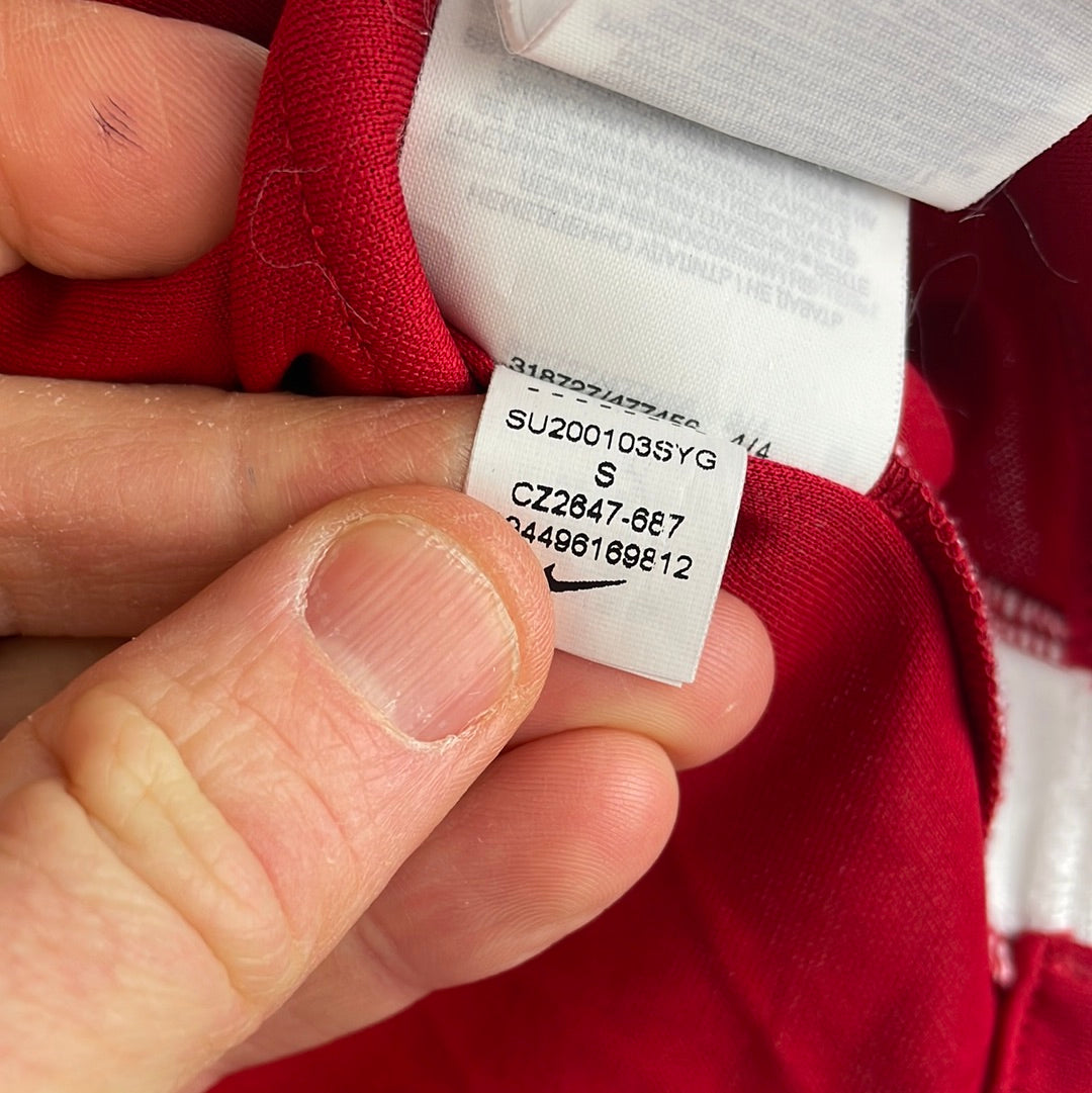Shirt info: The red home shirt in the 2020/2021 season. This has a white v-neck collar with green trim and matching sleeve cuffs.