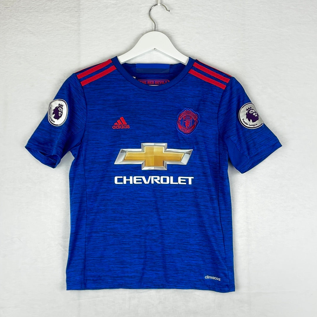 The blue 2016/2017 away shirt worn by Manchester United.