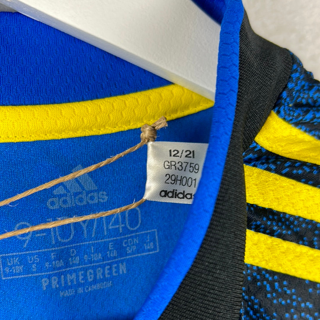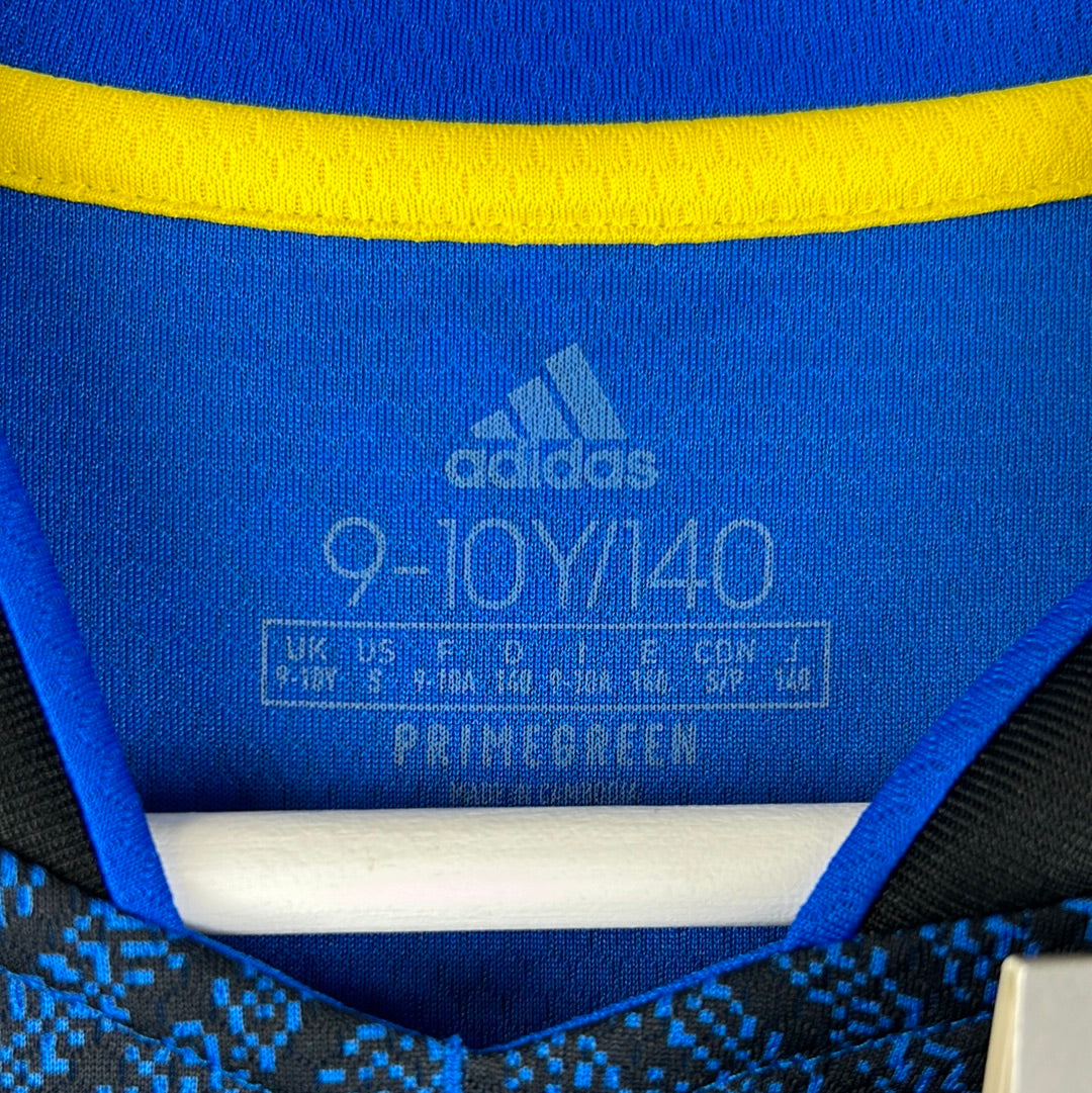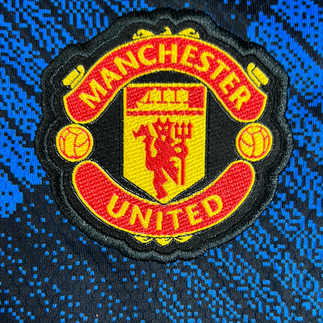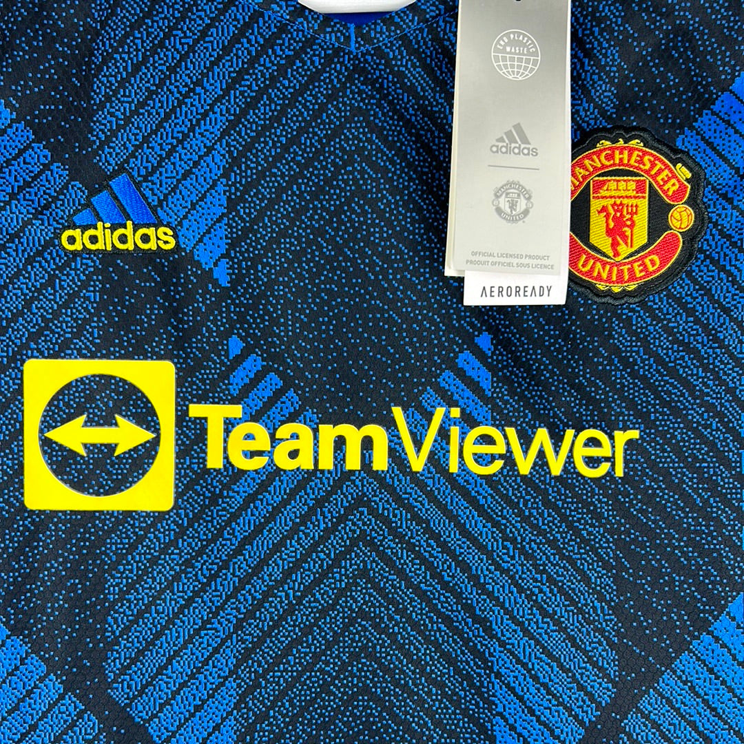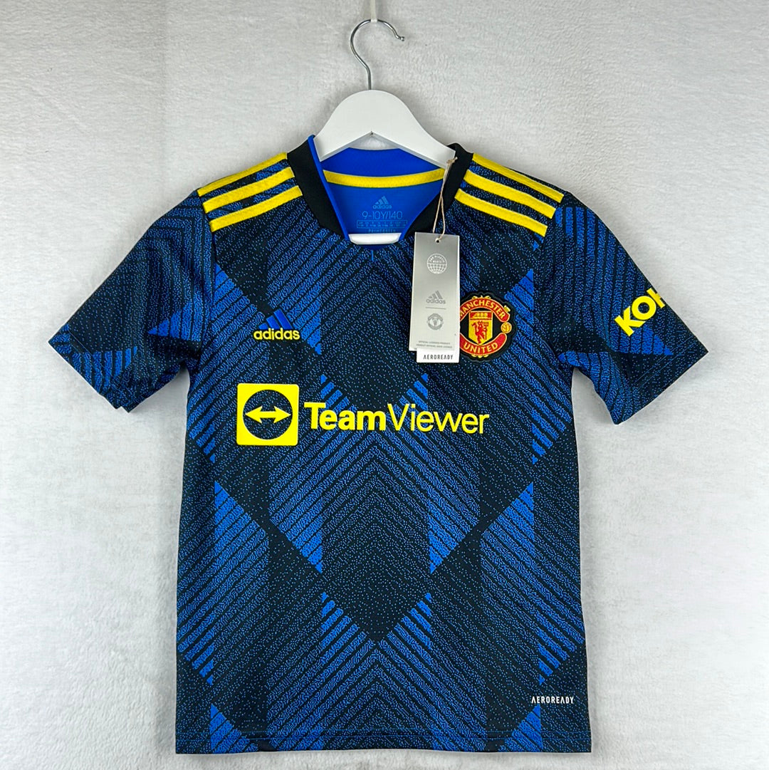 Shirt info: The Manchester United 2021-2022 third shirt worn during that season. One of the better shirts from recent seasons for Manchester United. A blue-away shirt with yellow detailing. This has a nice pattern and looks great when worn by the players. The back has 'Ronaldo 7' printed in white. The Adidas logo is a patch in blue and yellow to match the shirt's colourway, and the Manchester United badge is a patch. Team Viewer front sponsor and Kohler sleeve sponsor are in yellow.