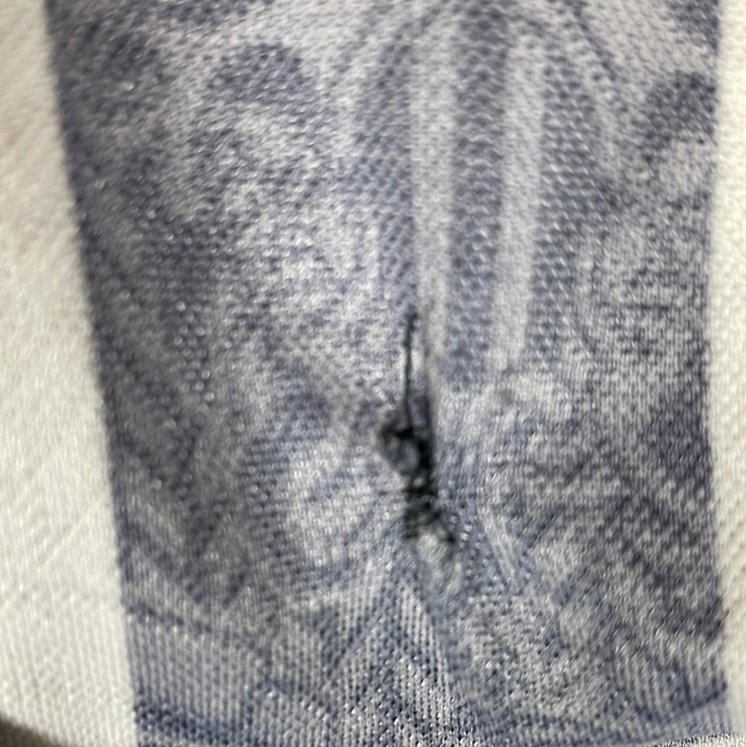 Condition Details: The shirt has been worn and has a few small marks. There is a hole in the front that has been repaired.