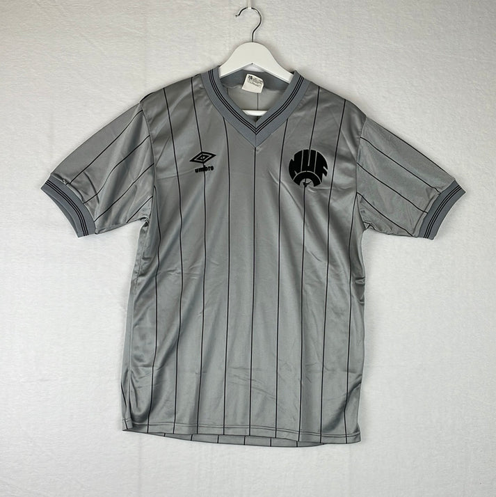 Umbro had a thirteen-year relationship with Geordie club that started out in 1980. There are a few beloved jerseys from this range and most of them came within the period of 1983 and 1987, albeit this wasn’t necessarily because of the shirt design. A large factor of this is because of the club crest used throughout these years. It was a curved design that had NUF above an upturned C. A small magpie was placed under the C. There was a particularly smart silky silver away strip that had black pinstripes, which featured this emblem, used between 1983 – 1985.