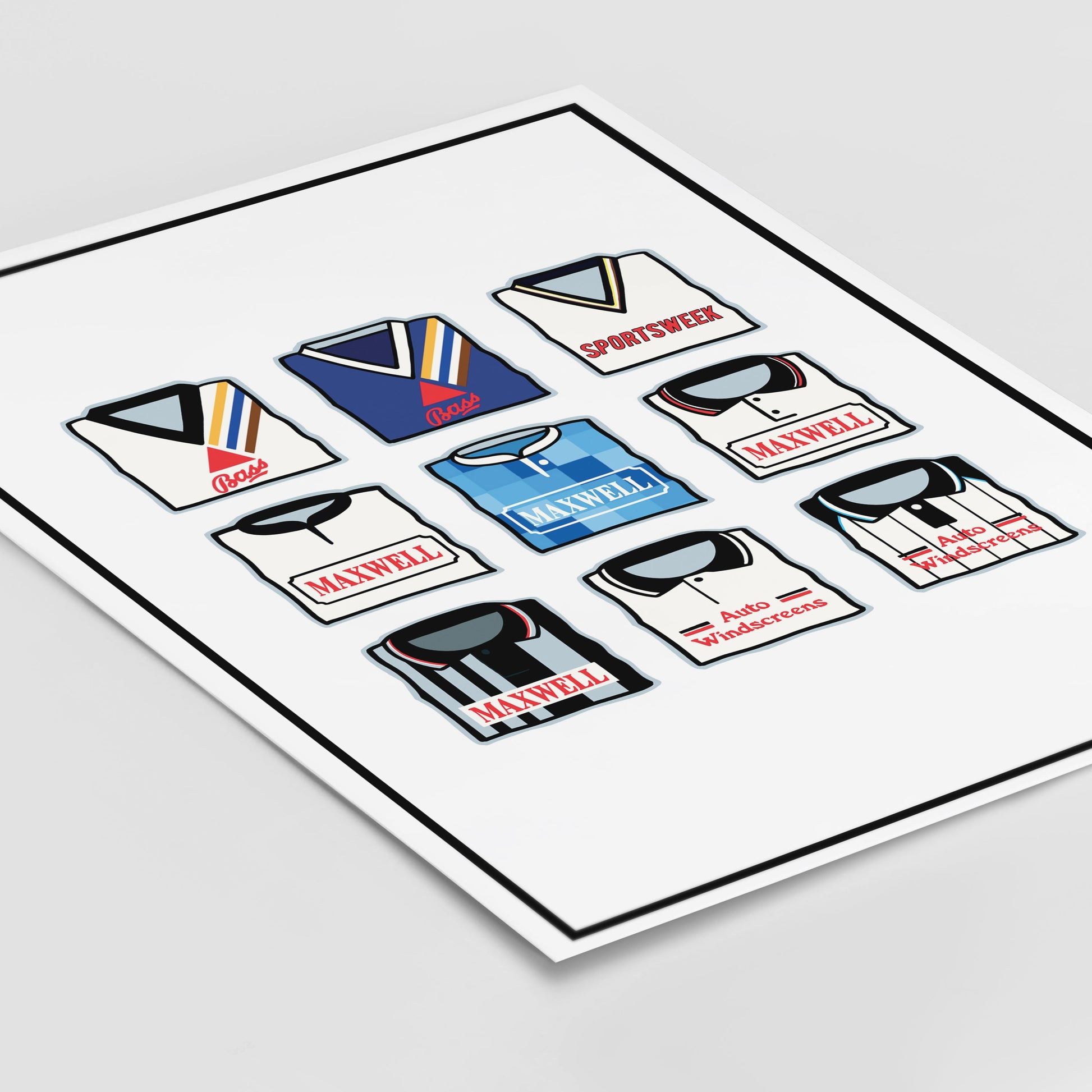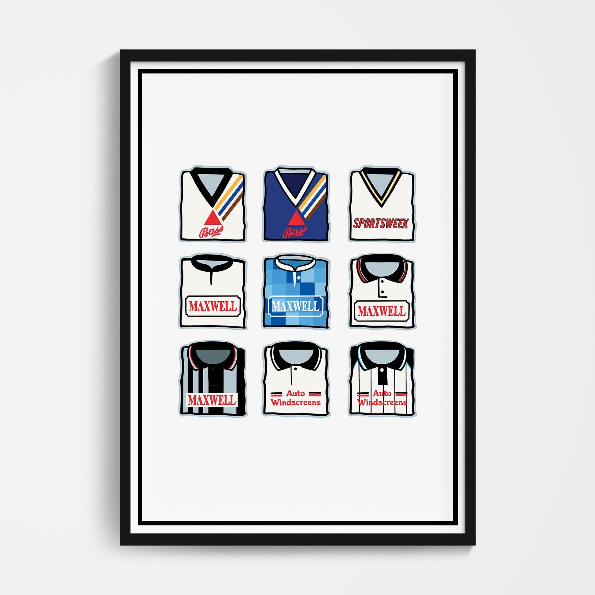 Original design featuring iconic classic retro football shirts on a quality poster.