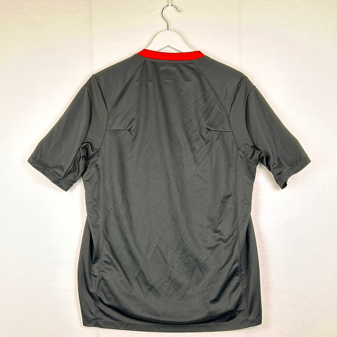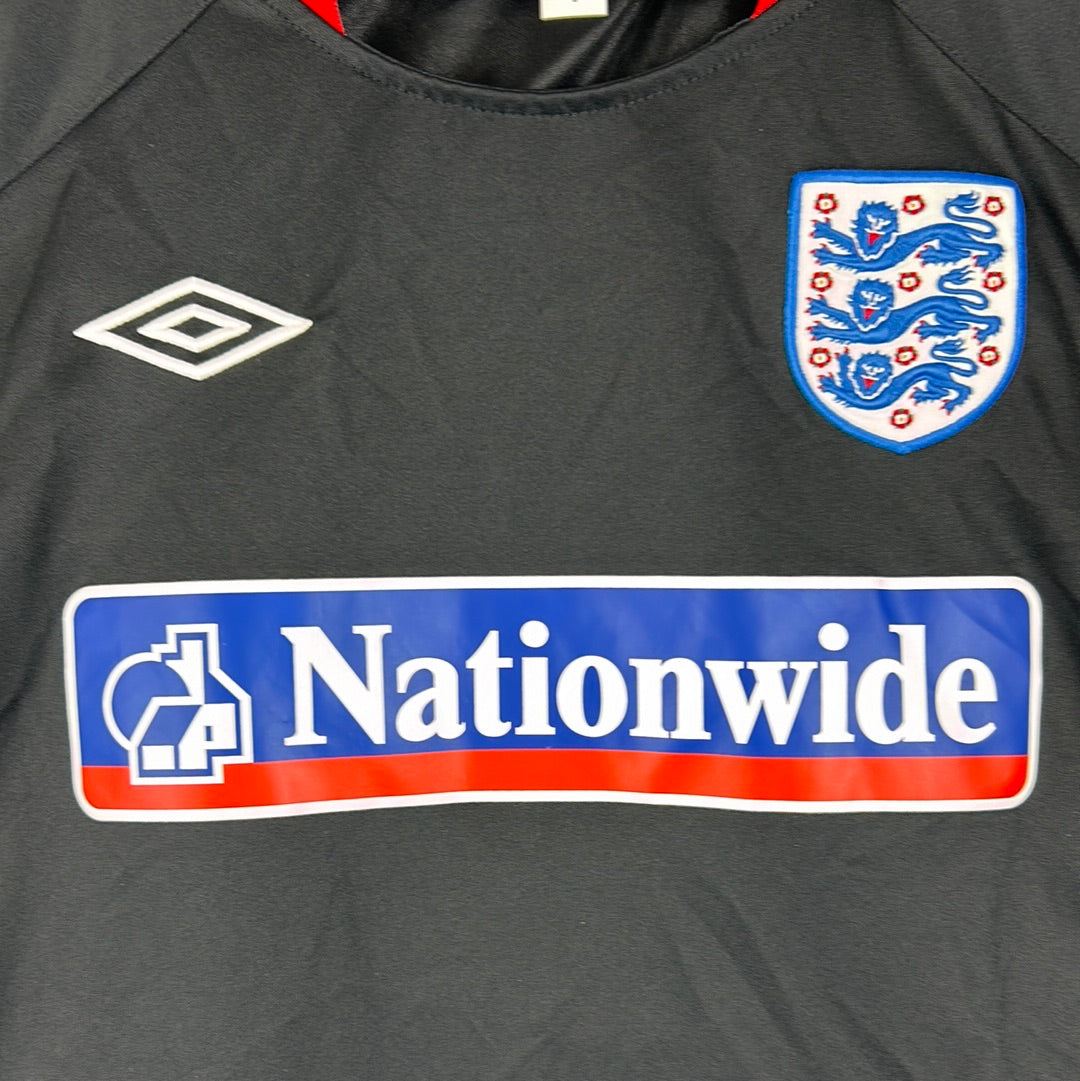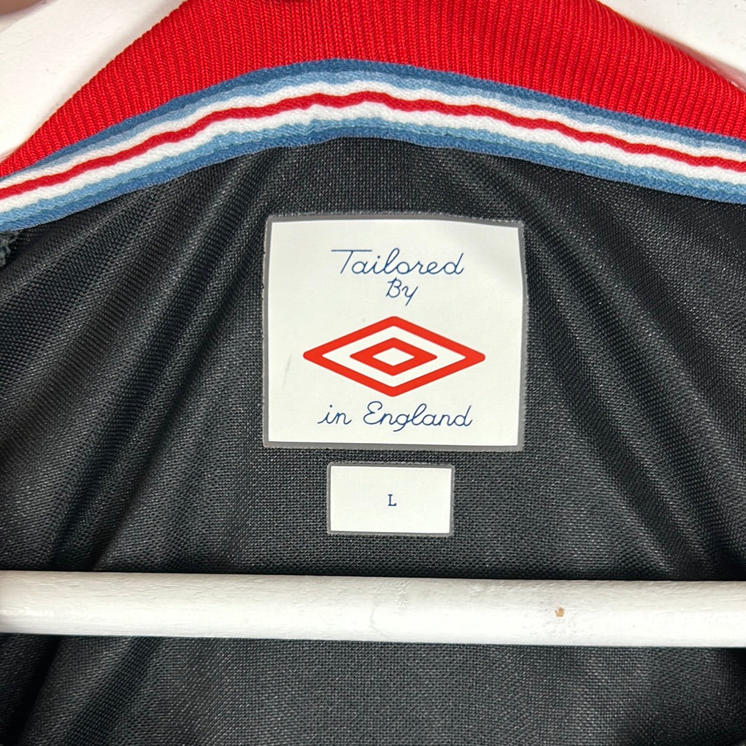 Shirt info: An England training shirt from the Tailored by Umbro range. This is a black shirt with red trim. It has the front Nationwide training sponsor.