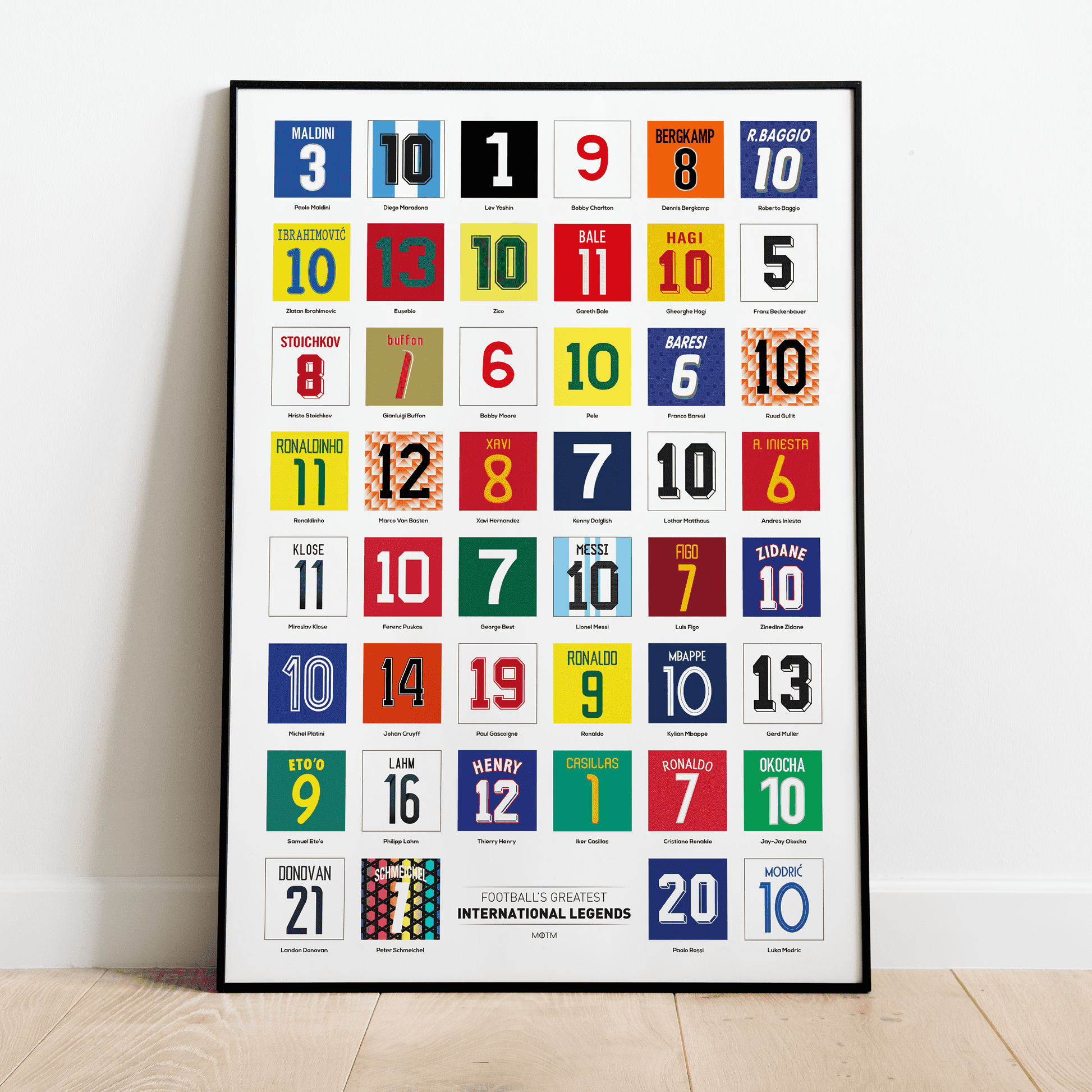 Legends of International Football Print. This poster celebrates 46 of the most iconic players to ever play the beautiful game. Featuring the shirts of legends such as Pele, Maradona, Messi and Ronaldo and many more, this is the perfect piece of football wall art for fans of all ages. Each one will bring back memories of a special goal, tournament, moment or match from the greatest football players of all time. This high quality print is the perfect gift for any football fan, perfect for any man cave wall, to decorate a sports bar or décor for a contemporary office.