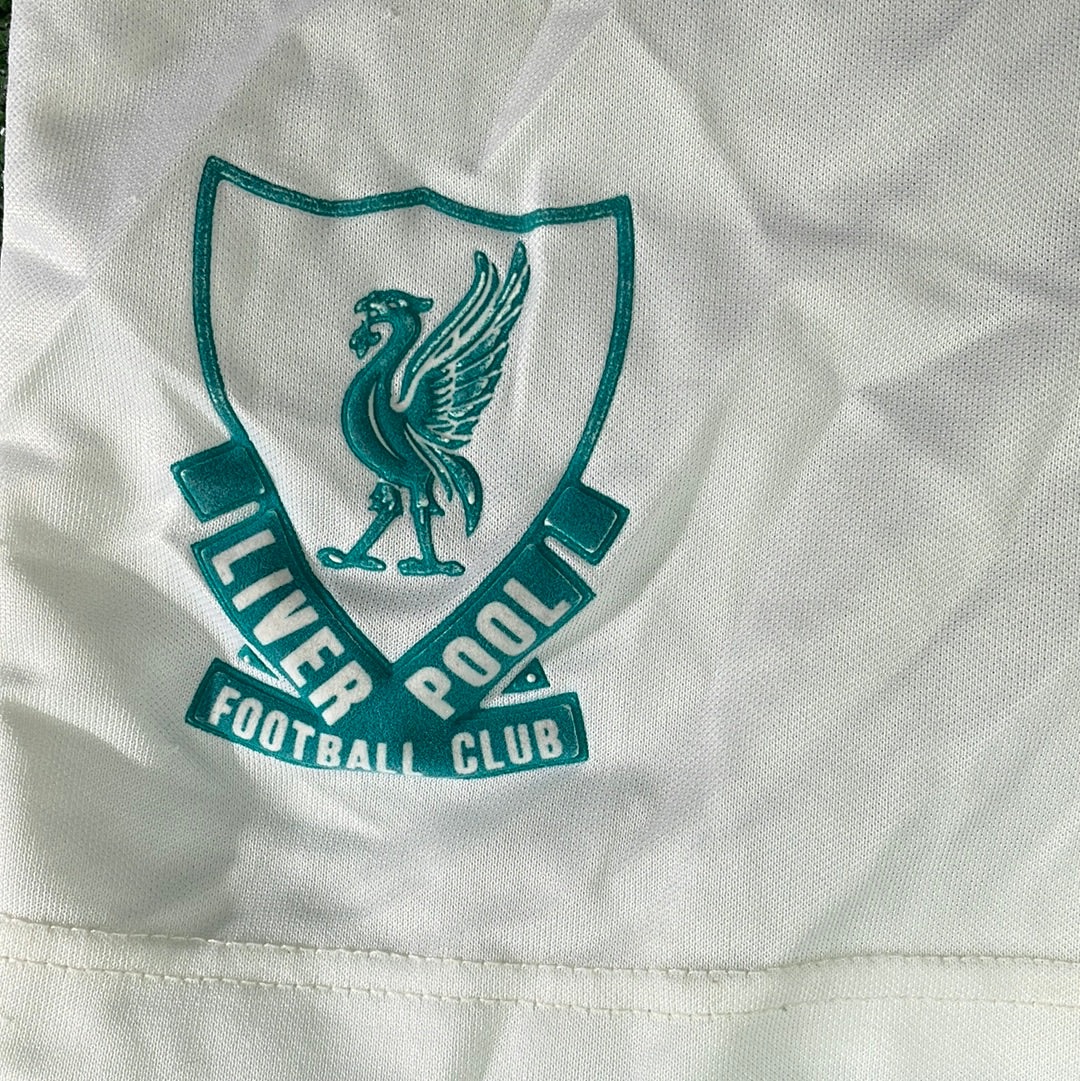 Shirt info: Iconic away shirts for Liverpool in the 1991/1992 and the 1992/1993 seasons. White with 3 green stripes.
