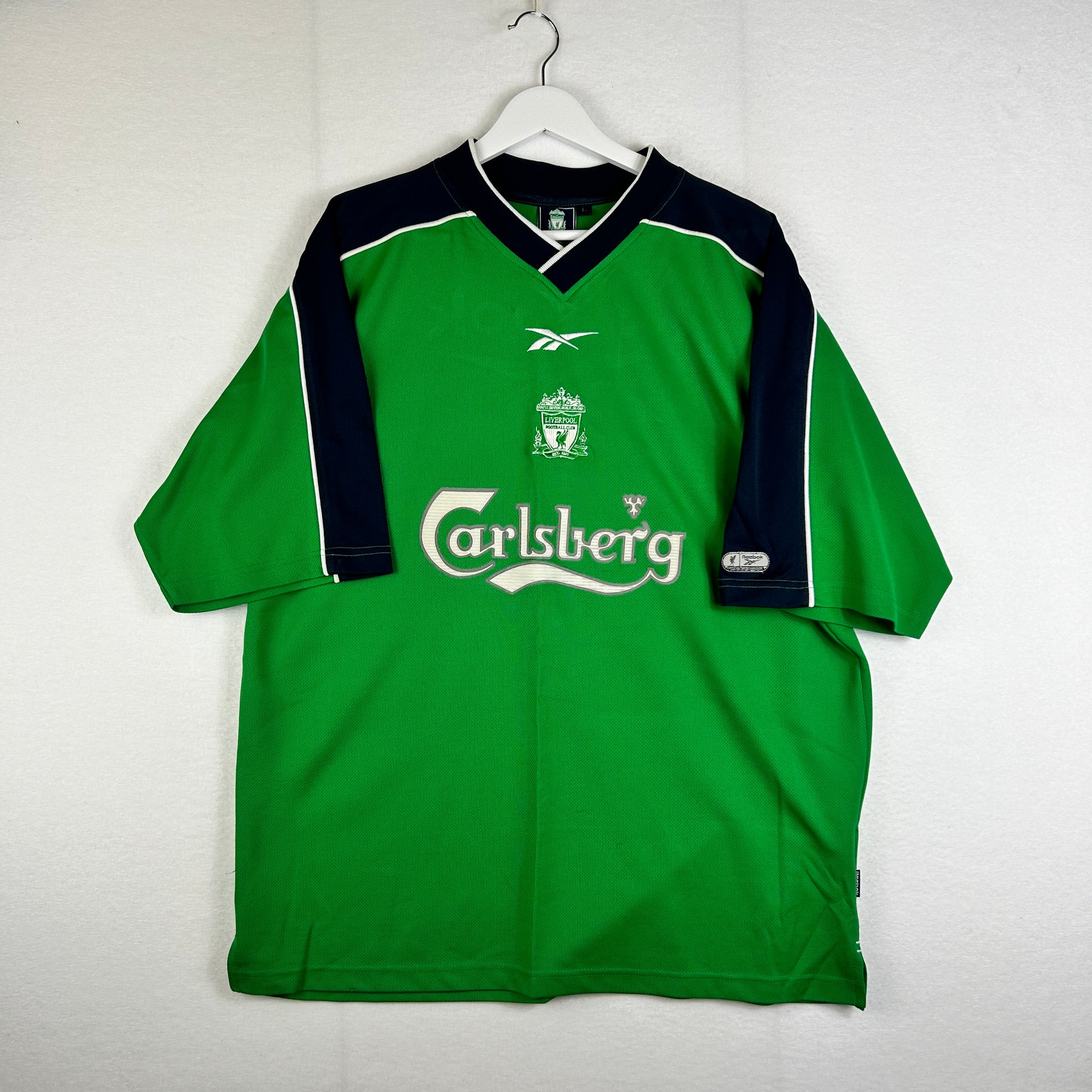 Shirt info: This is the Liverpool training shirt from the 1999/2000 season. The design is very similar to the away shirt that season. It has Casrlsberg on the front and back in a flat felt print.
