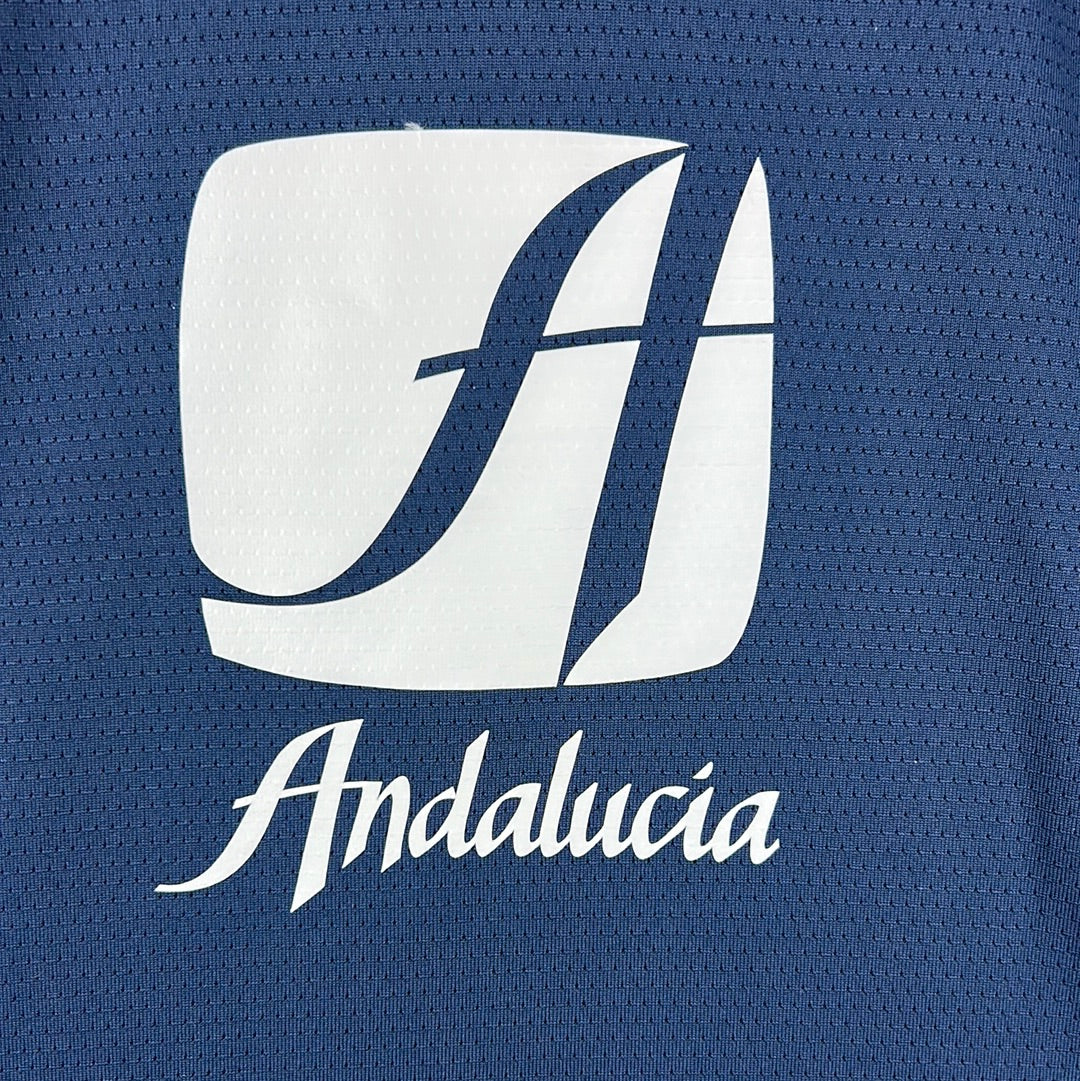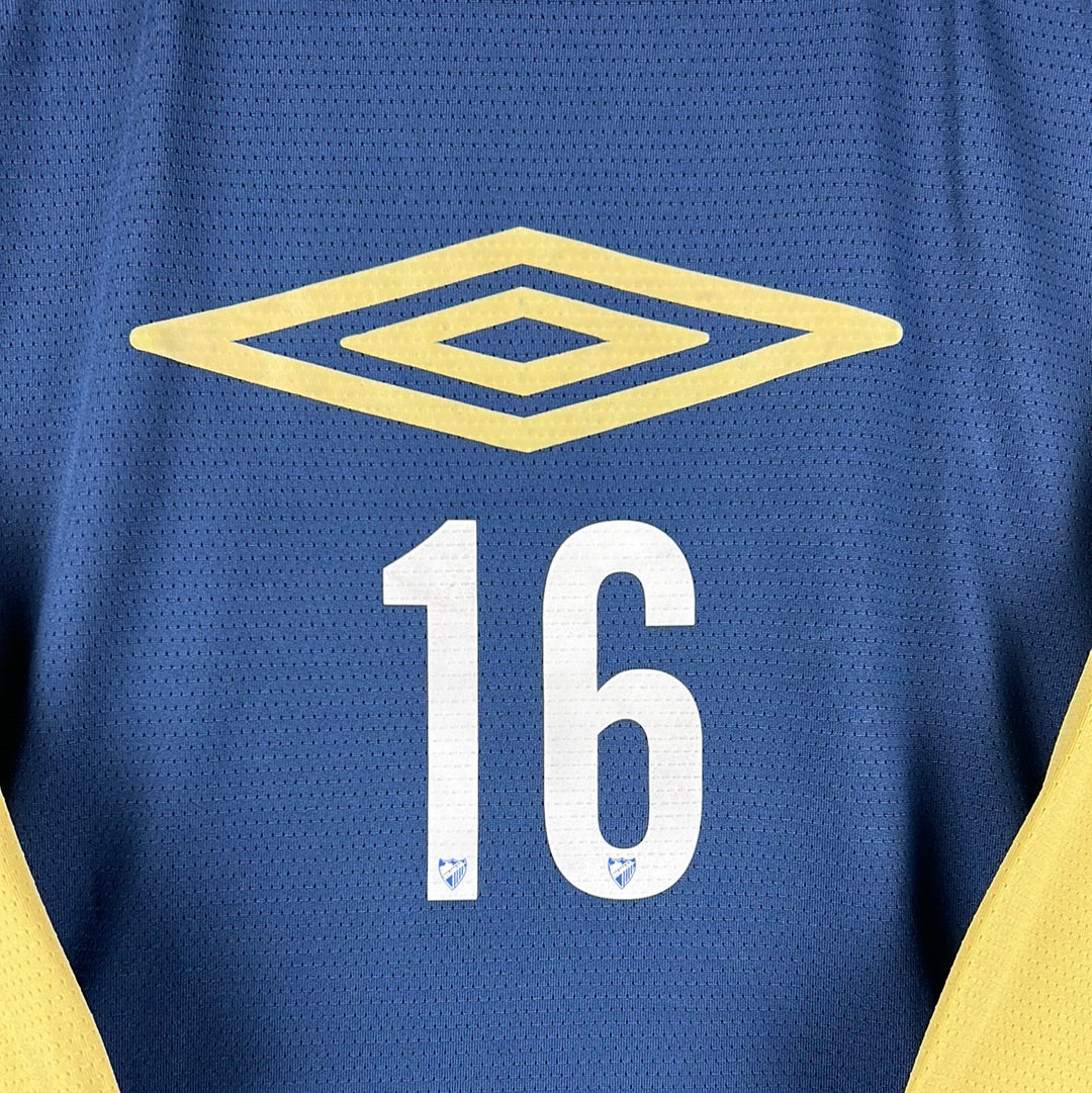 Shirt info: This is a dark navy Malaga football training t-shirt. The shirt features gold detailing throughout, an embroidered Malaga badge, and an Umbro logo. It also has a white printed 'Andalucia' sponsor and a printed '16' on the back as well as another gold Umbro printed.