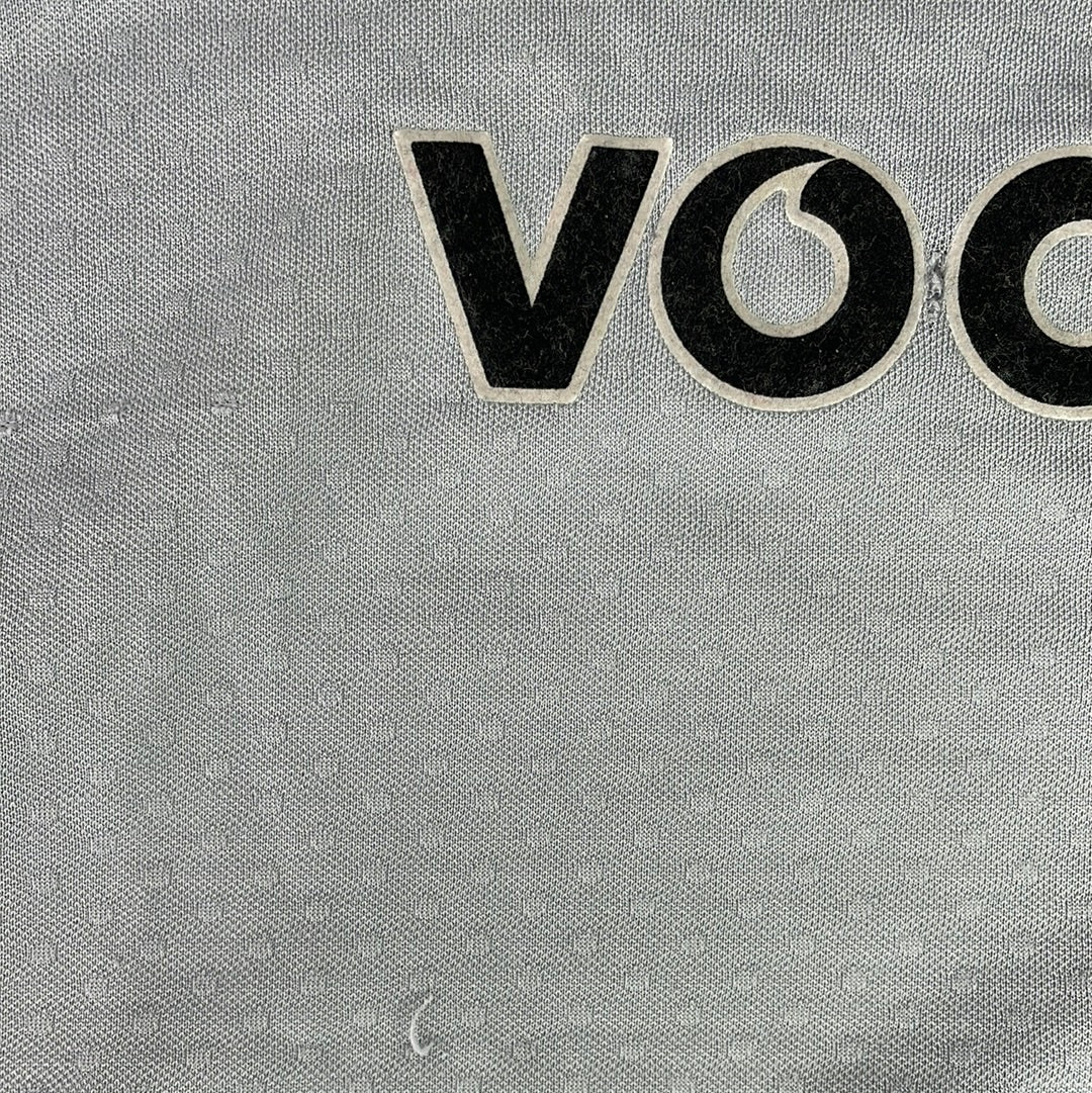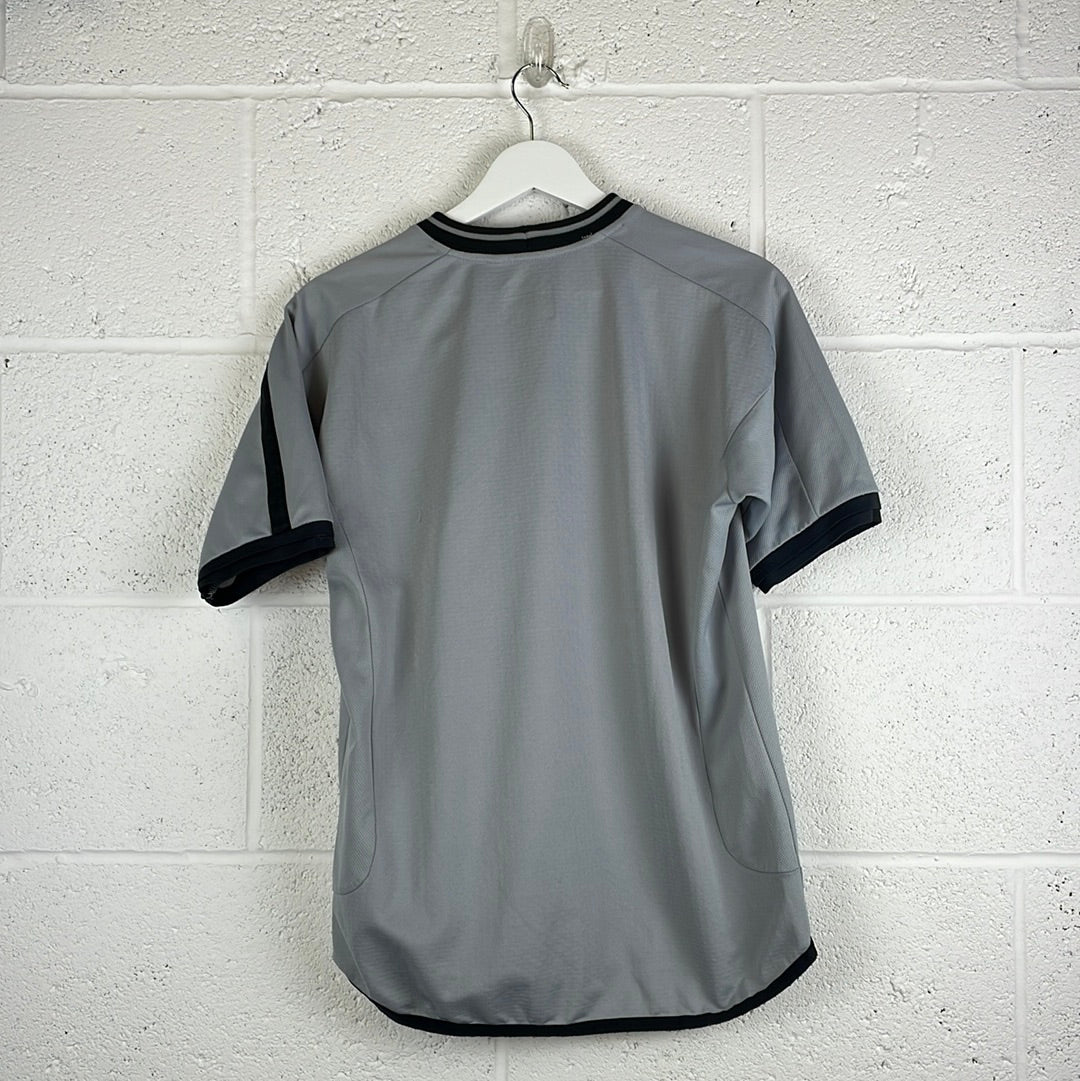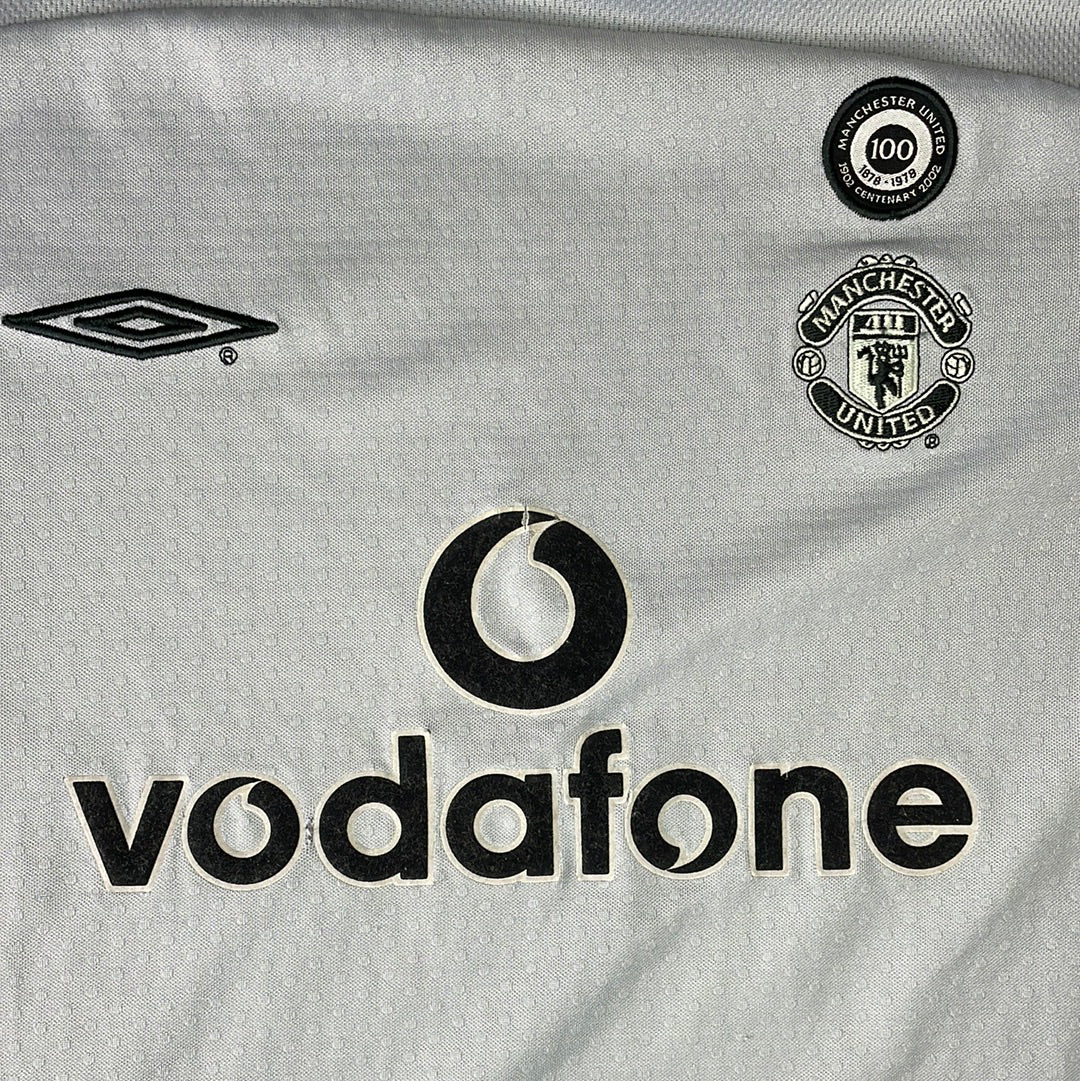 Shirt info: A grey away goalkeeper shirt for Manchester United in the 2000/2001 season and the 2001/2002 season. This was the 100th centenary year and the shirt has a small patch above the badge showing this.