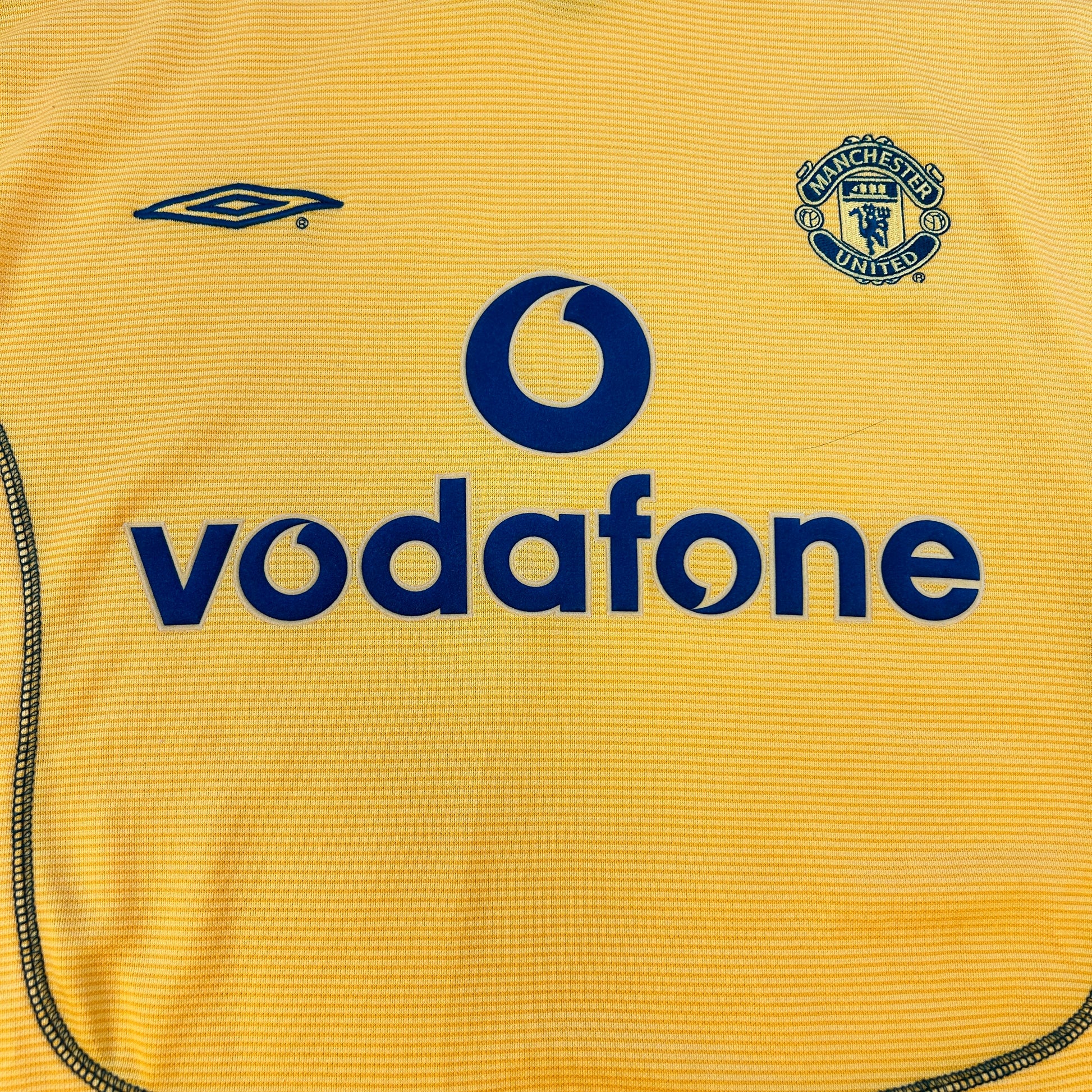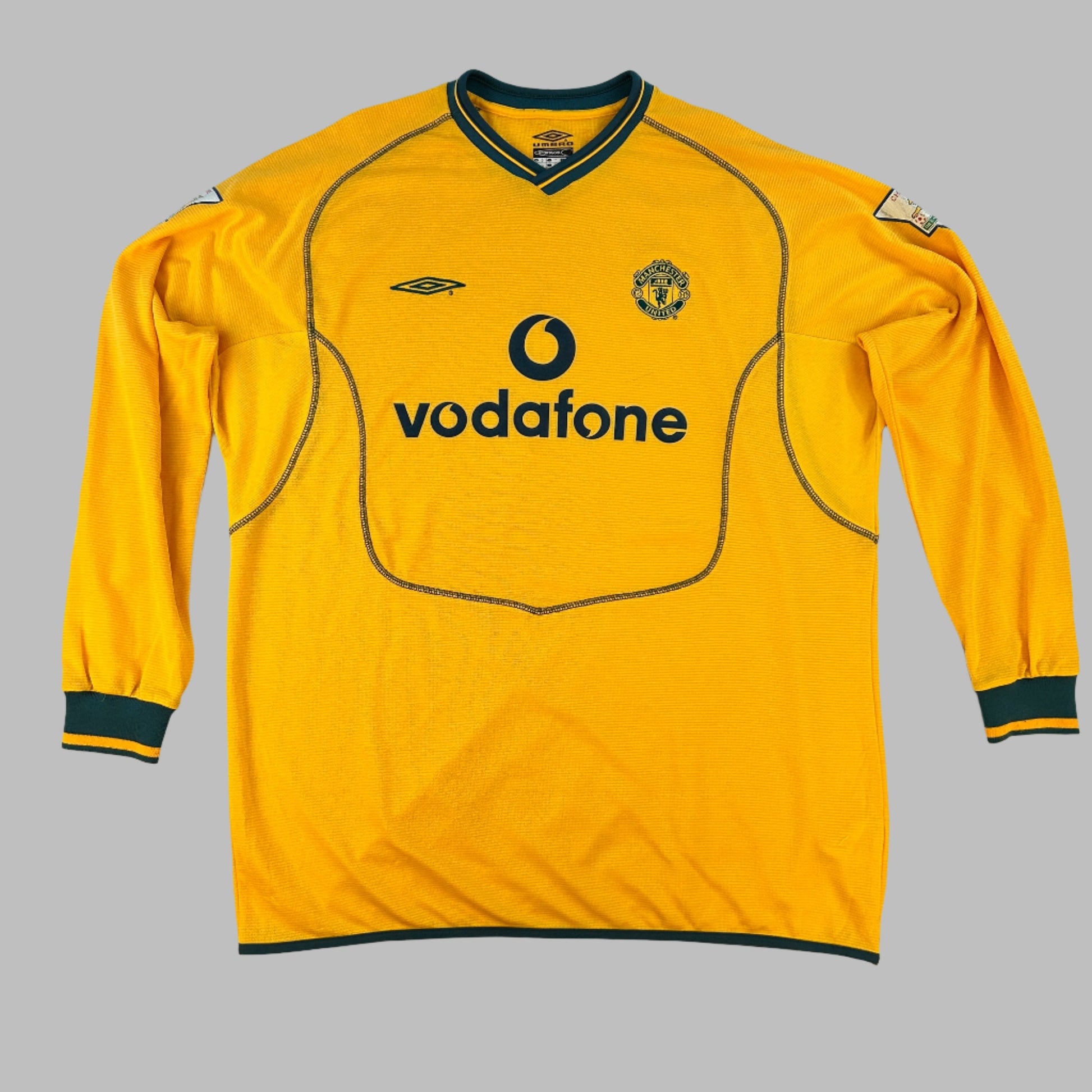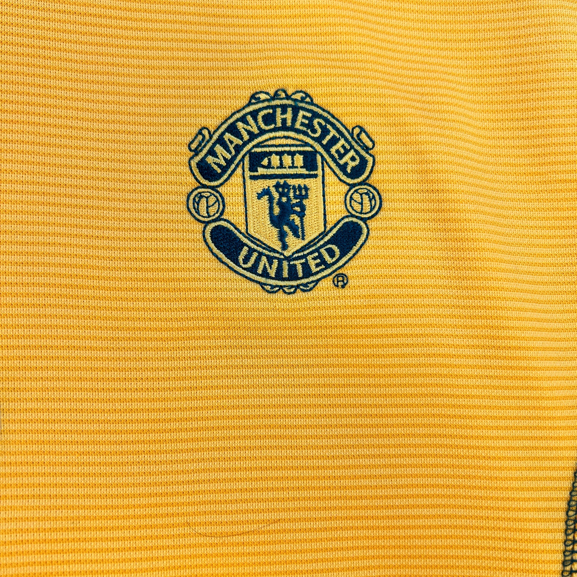 Shirt info: This is a rare yellow goalkeeper shirt worn by Manchester United from 2000 to 2001 and 2002. It is part of the Umbro Sports wool collection and is thick and heavy compared to a modern-day football shirt.