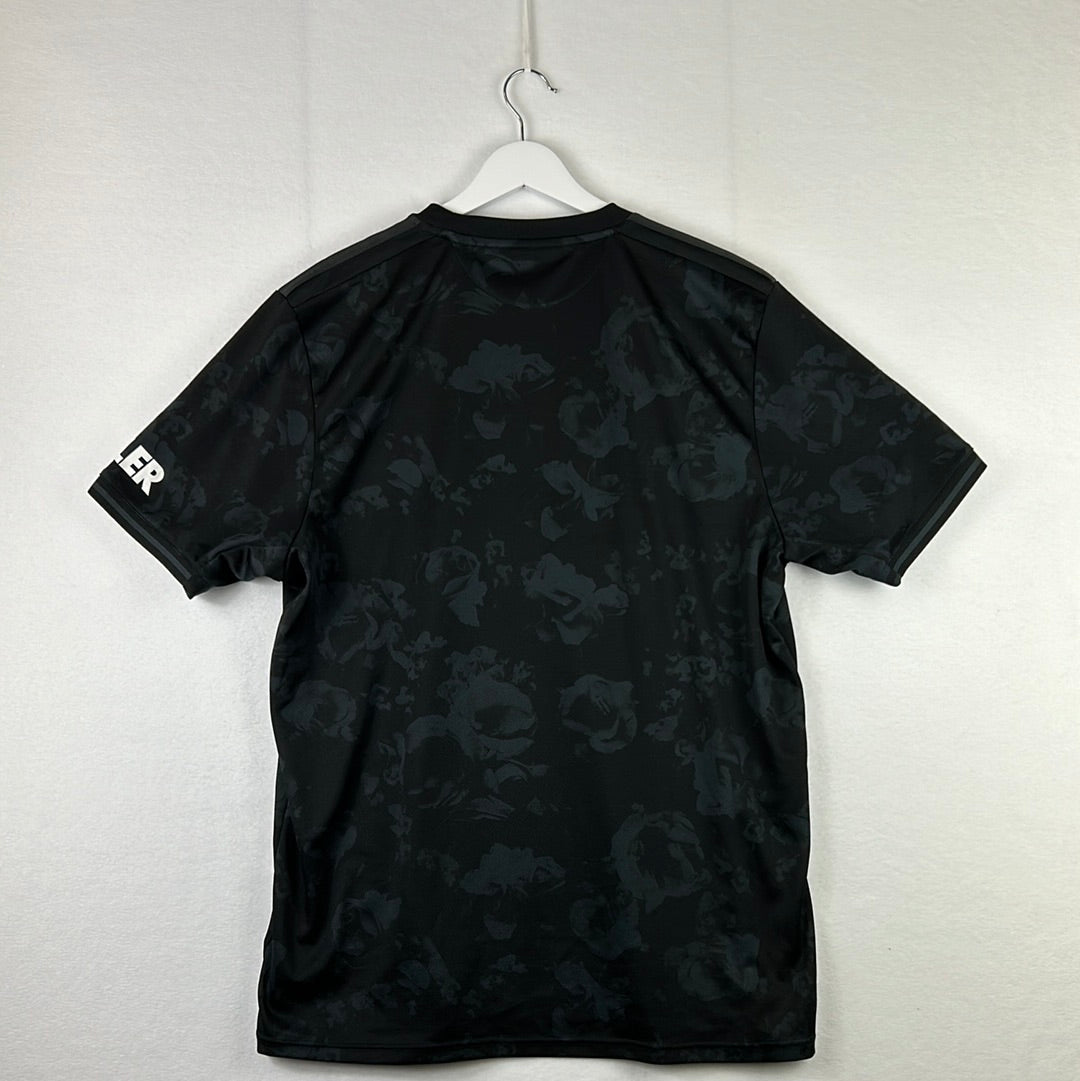 Shirt info: The black third shirt from the 19/20 season. This design celebrated 110 years of the Manchester Rose. The Adidas logo and Manchester United are bright red bordering on pink. It is very similar in look to Manchester United's 2020/2021 away shirt.