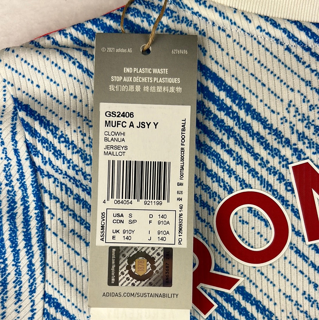 Shirt info: The Manchester United 2021-2022 away shirt worn during that season. This is a modern re-imagining of the 1990 'snowflake' away shirt. The shirt features; a white round neck collar, an Adidas logo embroidered in red and the Manchester United badge is a patch. The 'Team Viewer' sponsor is printed in red to match the United badge, Adidas logo and 3 shoulder stripes. Climalite printed on the lower front. 'Ronaldo 7' is printed on the back in red.