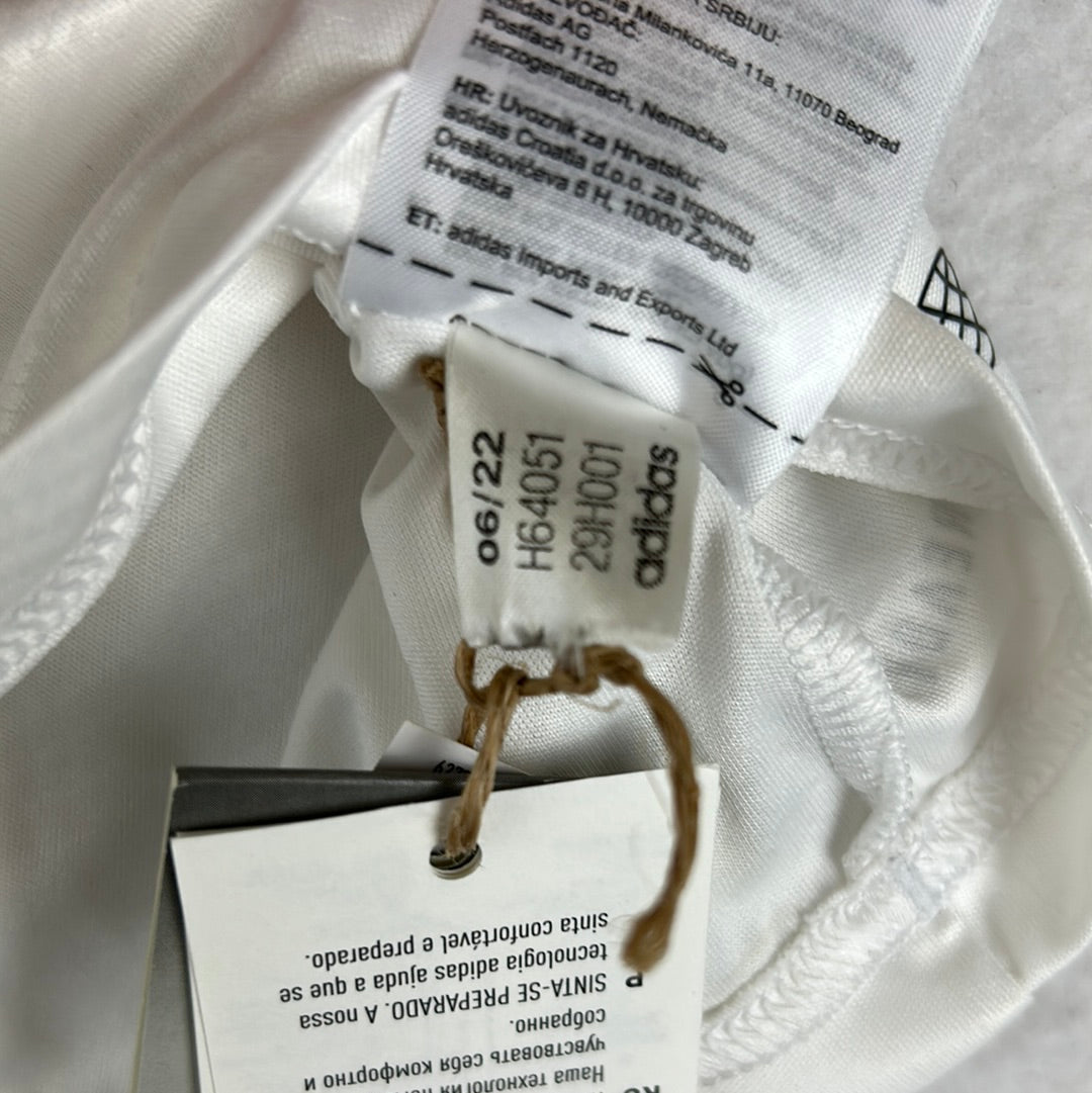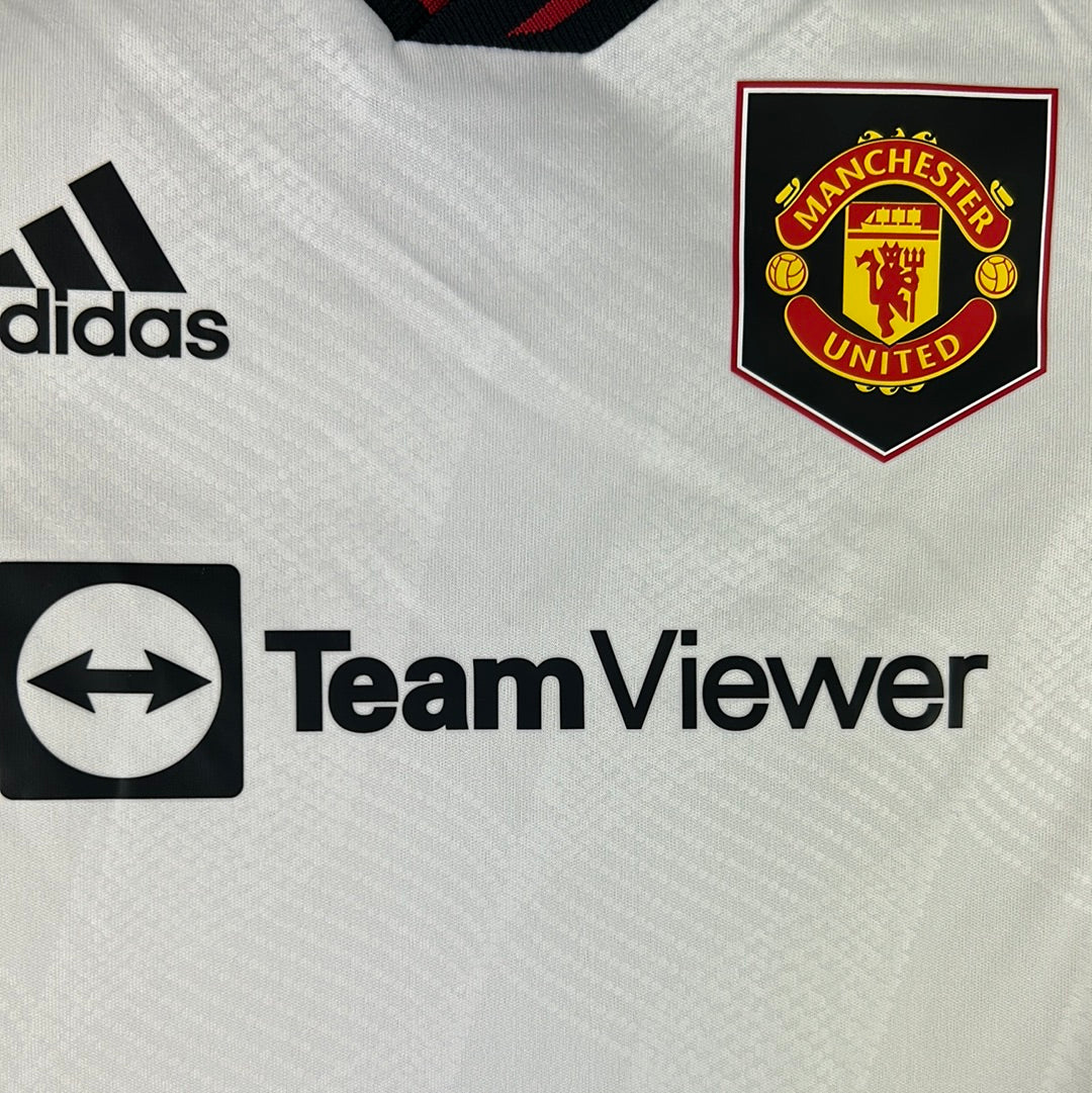 Shirt info: The white away shirt worn by Manchester United in the 2022-23 season. This has the team viewer sponsor in black on the front and the DXC sleeve sponsor. The sleeves have the Adidas 3-stripe pattern in red and black. The Manchester United badge and Adidas logo are heat-pressed.