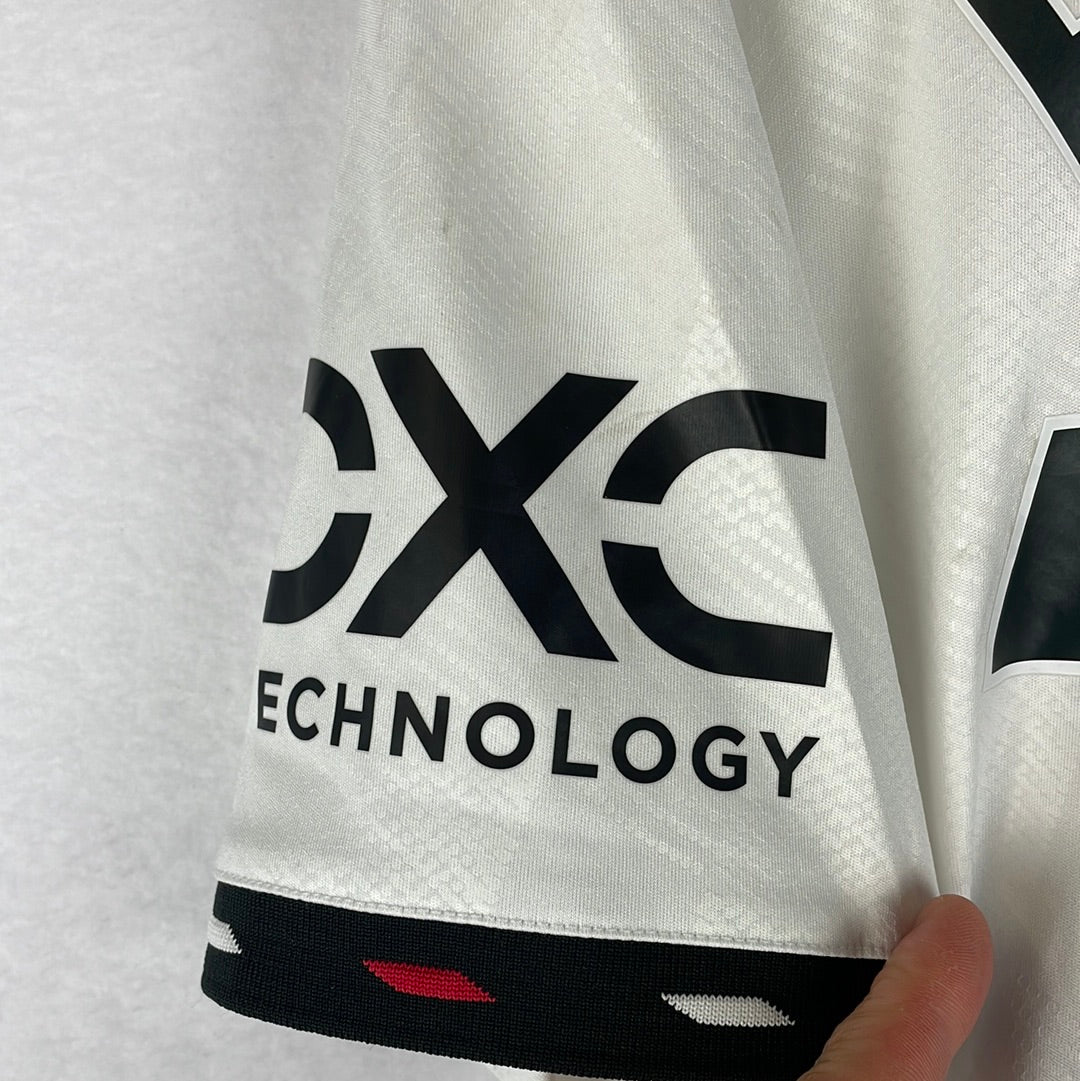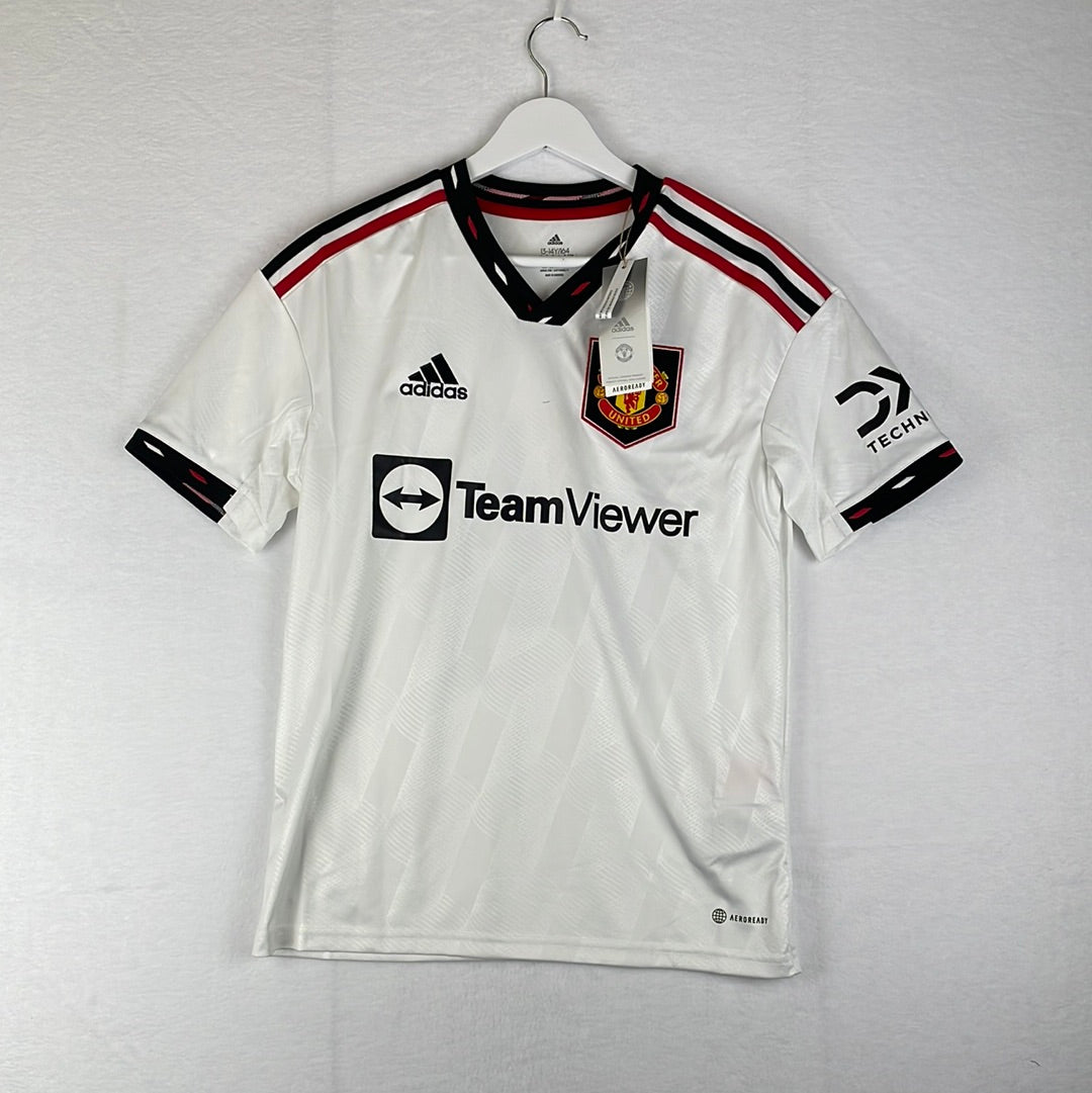 Shirt info: A nice white away shirt for Manchester United in the 22/23 season. This has the team viewer sponsor in black on the front and the DXC sleeve sponsor.
