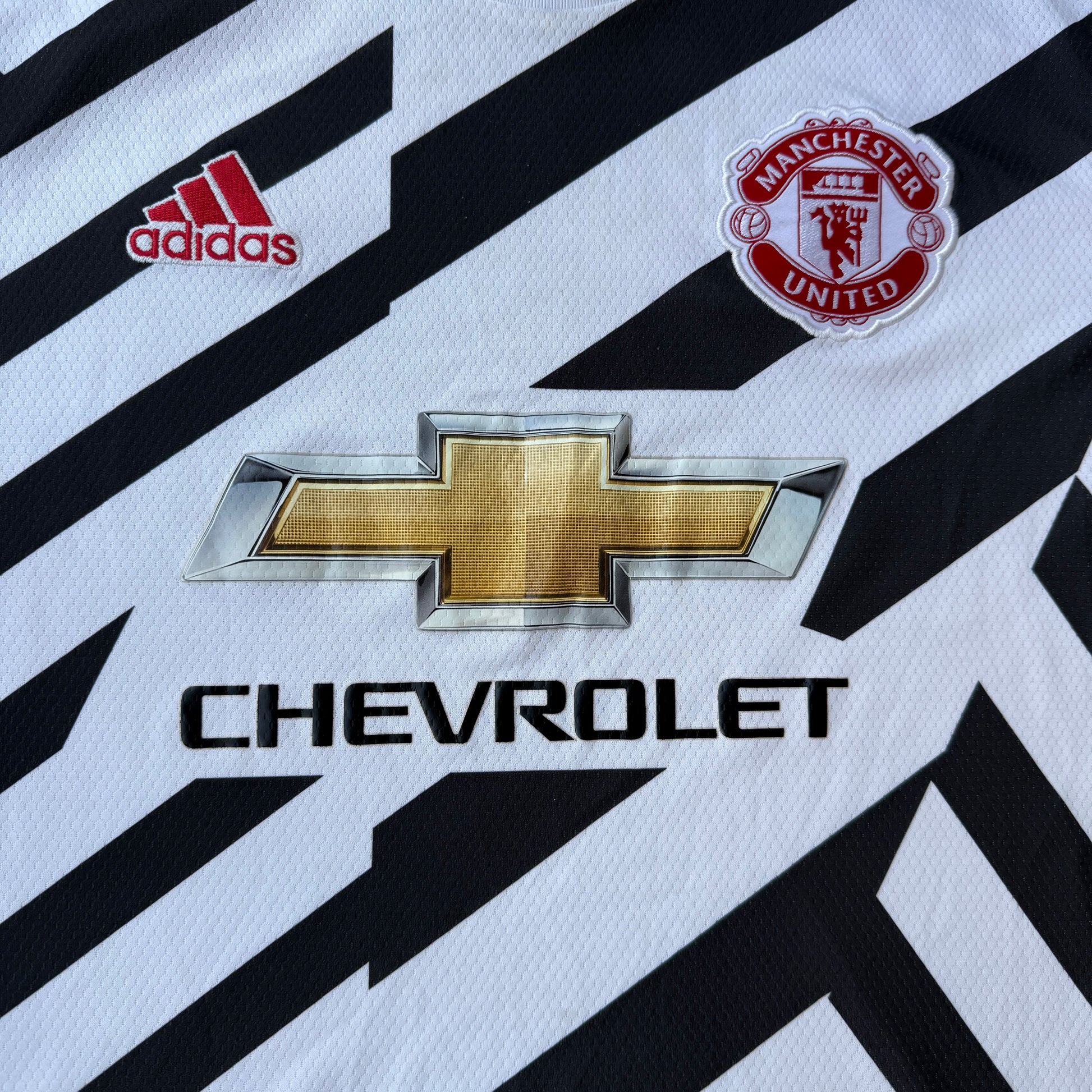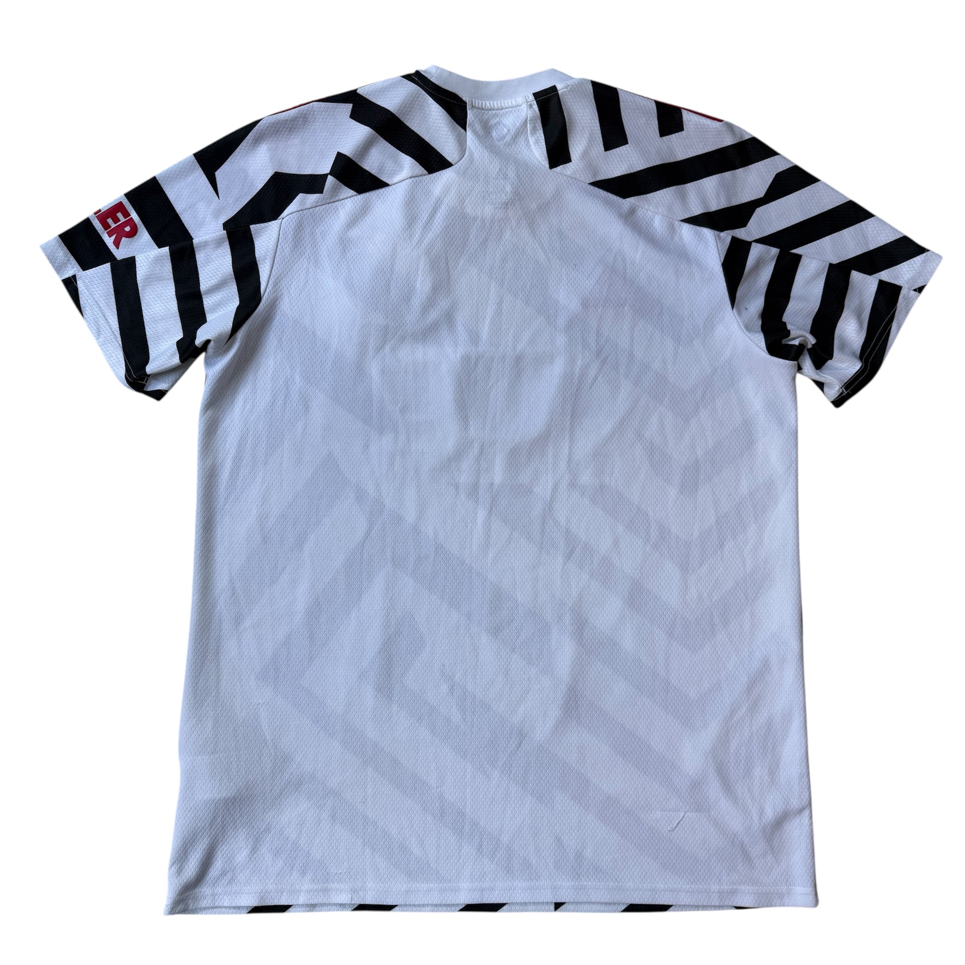 The Manchester United third shirt in the 2020/2021 season. This is a mixed white and black design that is one of the boldest United shirts from the recent period with Adidas.