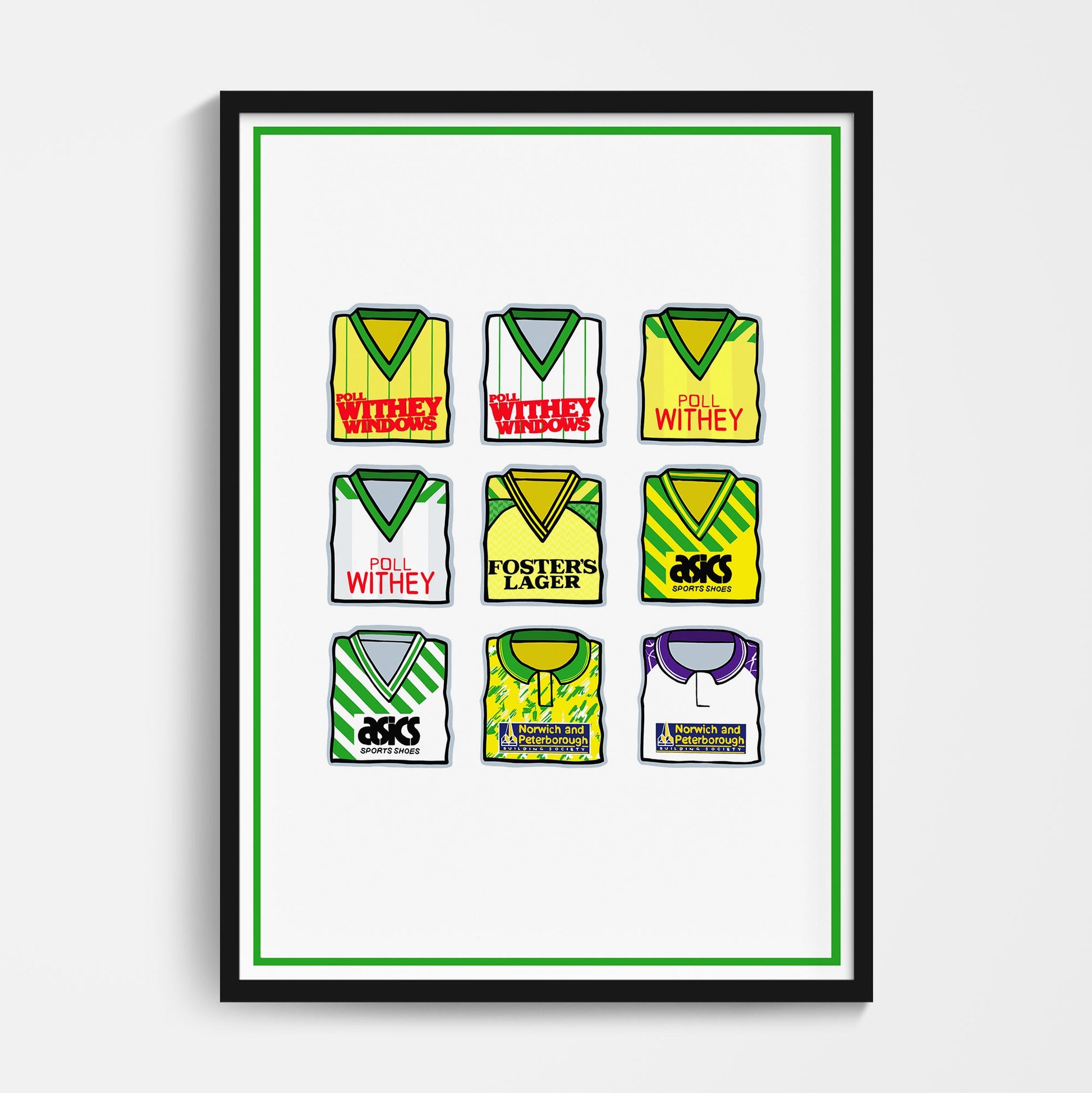 Original design featuring iconic classic retro football shirts on a quality poster.
