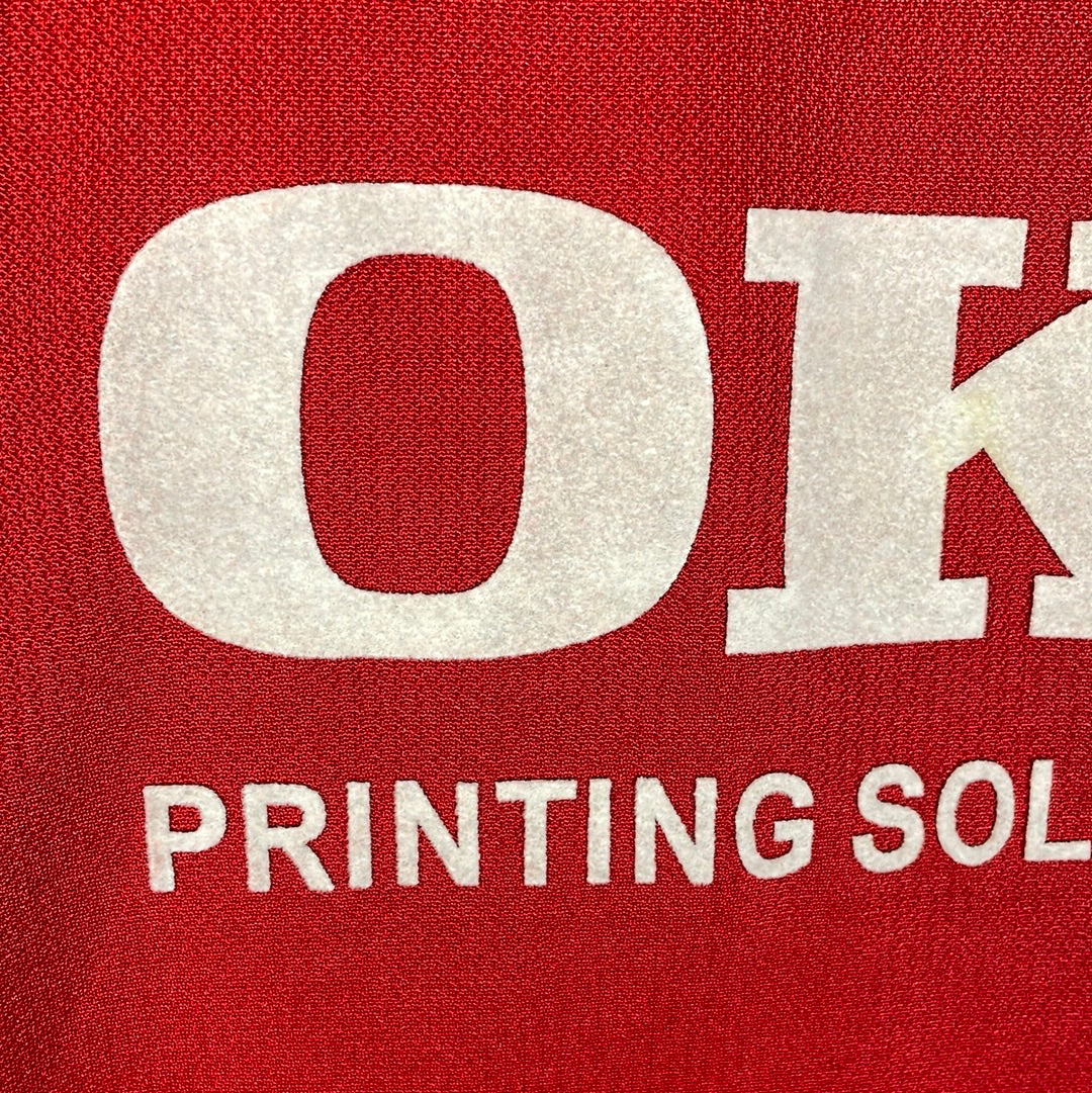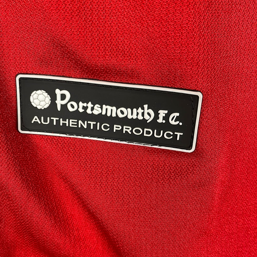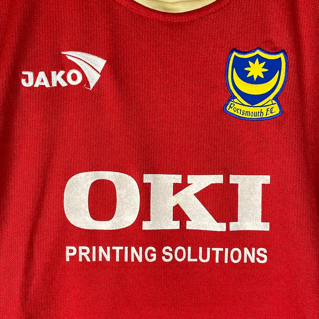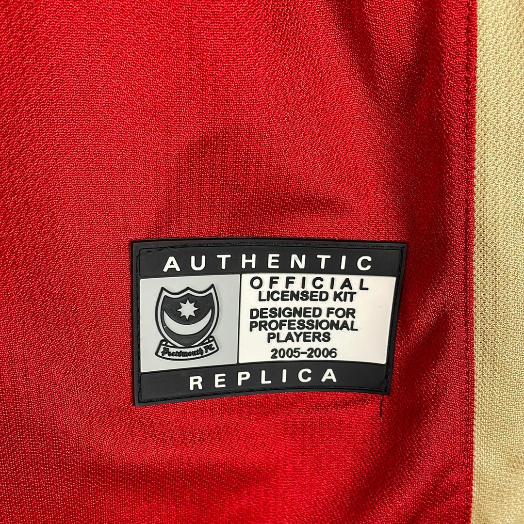 Shirt info: A long-sleeve away shirt for Portsmouth in the 2005/2006 season. The shirt is mainly red with a gold side and back trim. It is sponsored by OKI Printing Solutions. On the lower front there is a Portsmouth FC authentic rubber patch and an official licensed kit rubber patch.