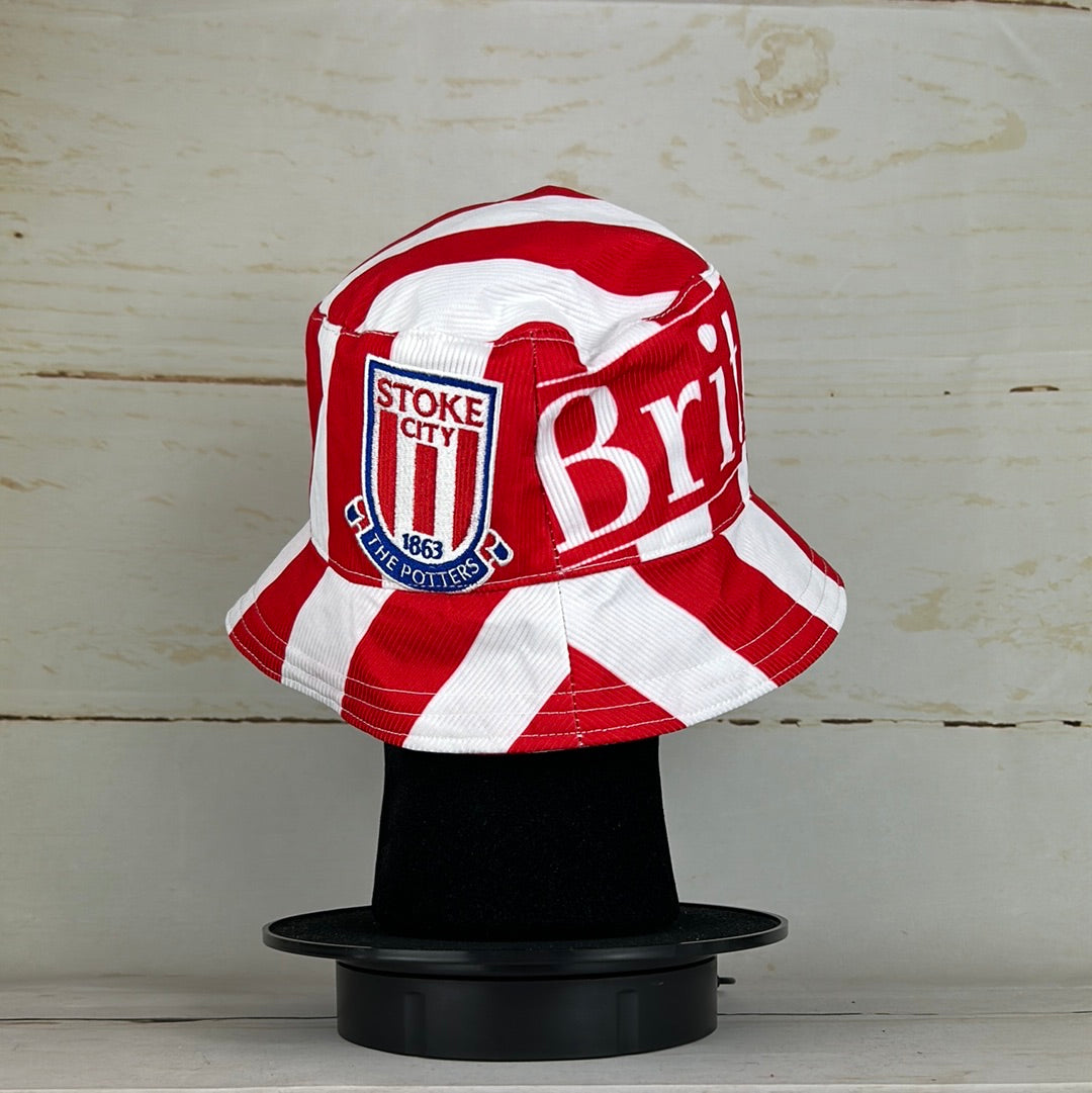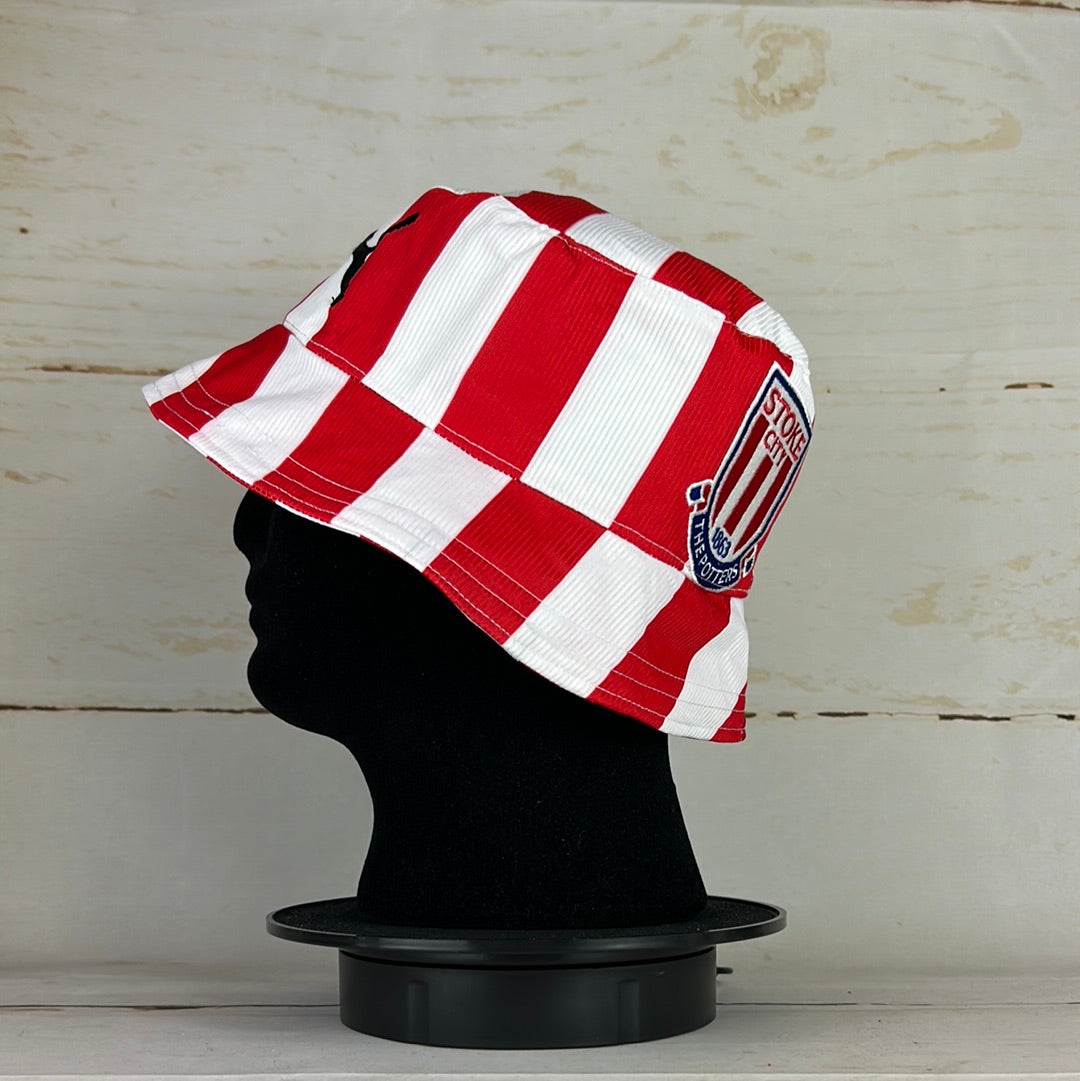 Bucket Hat Info: This custom Stoke City bucket hat is made from a red and white striped 2004/2005 home football shirt. It has a large Stoke City badge on the side with the white Britannia sponsor and a black Puma logo. The hat also has a red and white striped design throughout and on top.