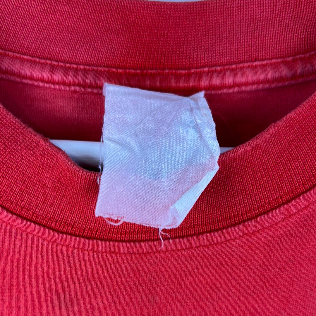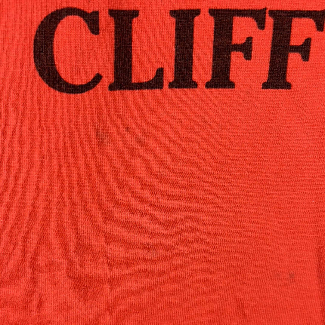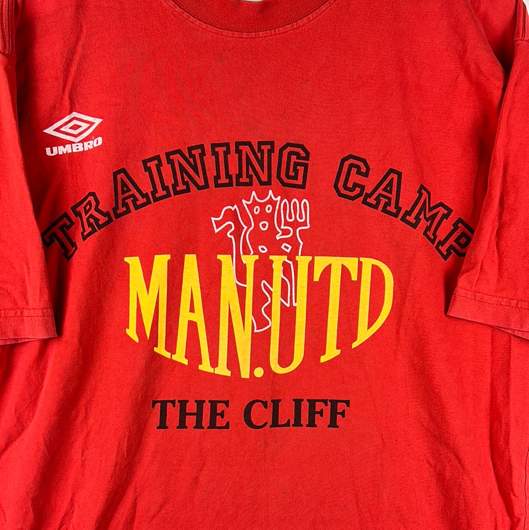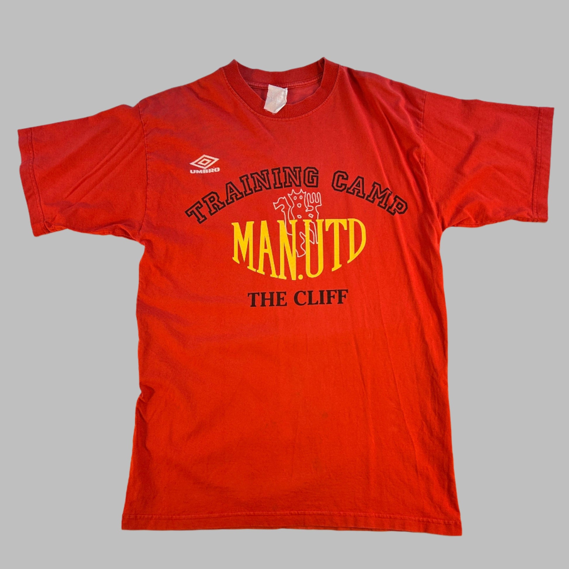 Shirt info: A red vintage Umbro Manchester United training T-shirt which has 'Training Camp Man Utd The Cliff' printed on the front with a Devil emblem. The back features an Umbro logo with the words 'The Heart And Soul Of Football' printed.
